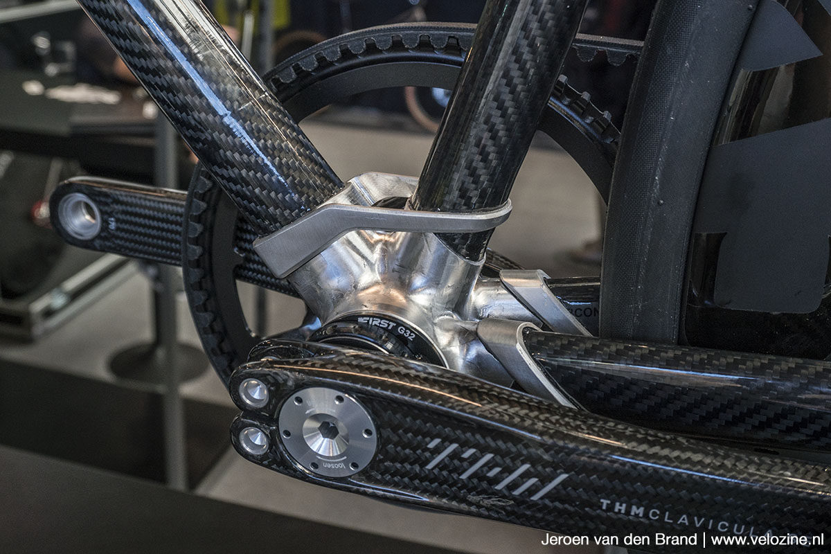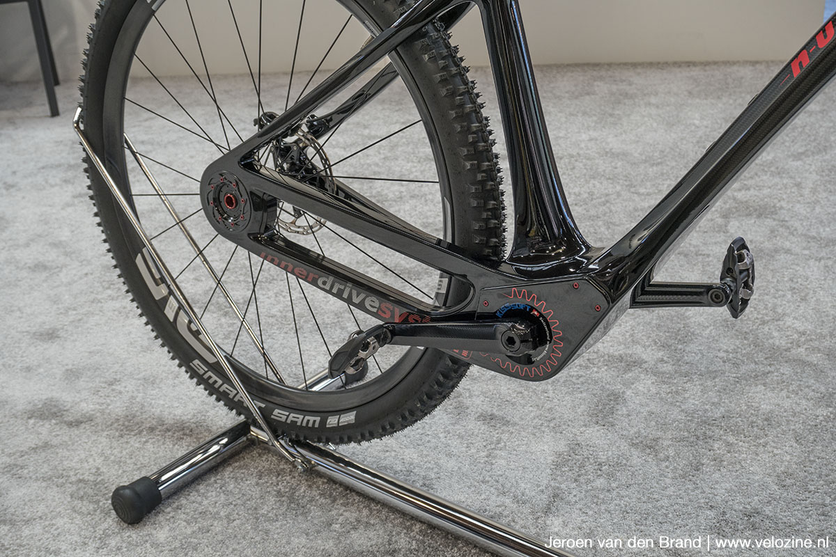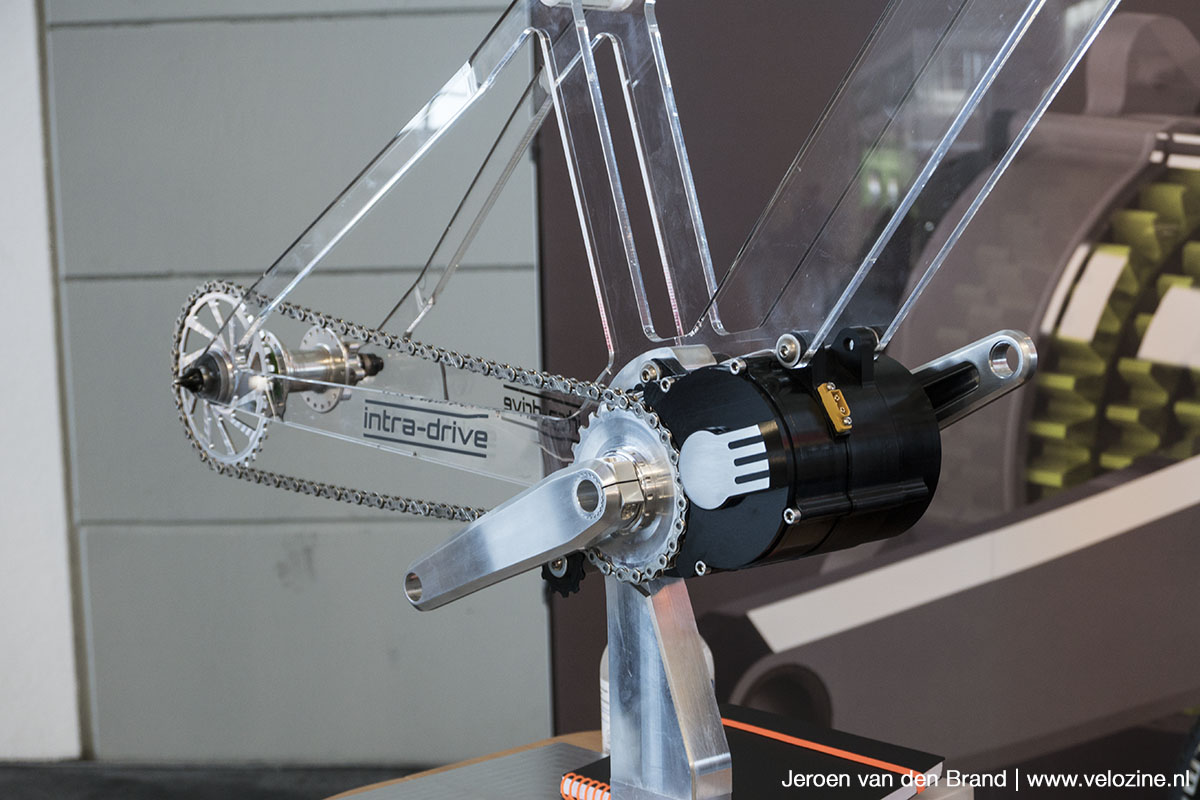 Nuseti aan hun unieke concept waarbij ze frame en aandrijving verregaand integreren. Rond de trapas zit een gearbox en de aandrijving naar het achterwiel is geheel afgesloten en loopt in een oliebad.