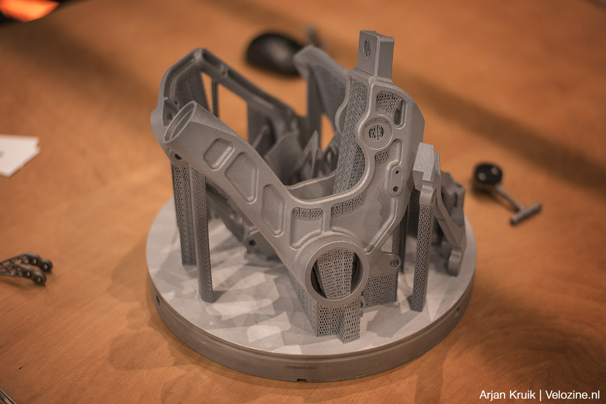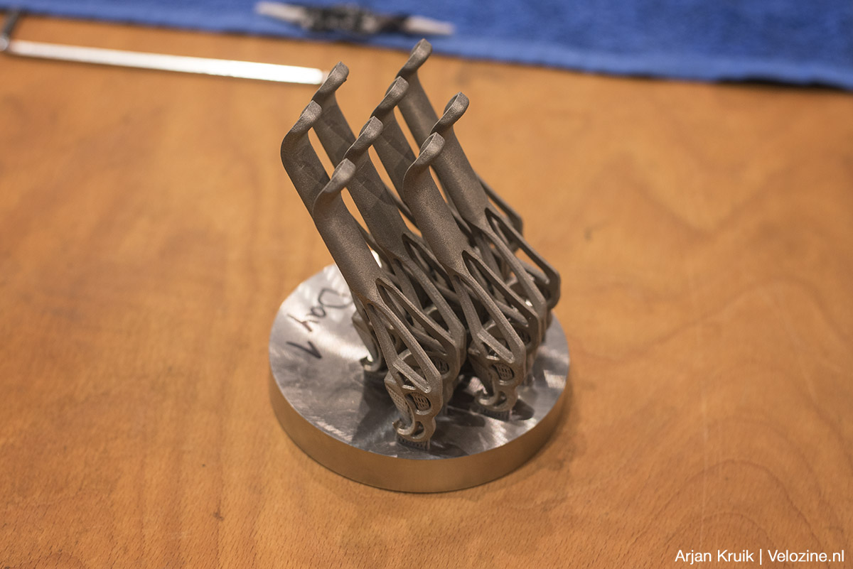 Tijdens eerdere edities van de EuroBike zagen we 3D-geprinte onderdelen. 3D-printen is dan ook niet echt nieuw meer. Al heel wat jaren maakt de technologie langzaam een opmars. In eerste instantie ging dat veelal over kunststof onderdelen, waarbij de printtechnologie het mogelijk maakte om snel visuele en zelfs functionele prototypen te maken. Het printen van metalen is stilaan ook gemeengoed. Niet alleen voor functionele prototypen, maar ook voor productiewerk. 3D-printen biedt namelijk veel meer vormvrijheid. Je hoeft als ontwerper je niet meer af te vragen of een onderdeel nog wel op een frees- of draaibank te maken is. Bovendien bespaart het materiaal; je smelt (met een laser) alleen materiaal samen dat je werkelijk gebruikt.