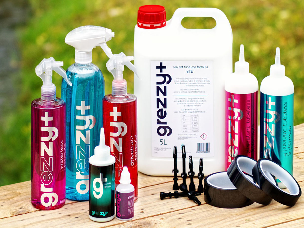 Naast velglinten, ventielen en dichtmiddel voor mountainbike- en racefietsbanden, bestaat het programma van Grezzy+ uit schoonmaakmiddelen. Grezzy+ E-Razer is een actief schuim dat je combineert met water, zoals je gewend bent van veel andere middelen. Grezzy+ heeft echter óók een ‘waterless’ formule. Juist ja; een middel waarmee je je bike kunt schoonmaken zónder water. Opspuiten, in laten weken en daarna afdoen met een doek is voldoende, zo beloofd Grezzy+. Bovendien laat het een antistatische film achter die de hechting van vuil en stof tegengaat. Dat klinkt behoorlijk veelbelovend wat ons betreft. Het programma van Grezzy+ omvat verder nog de Hyperlube kettingwax en de Slider Formula, voor het invetten van de rubber afdichtingen van je voorvork en achterdemper.