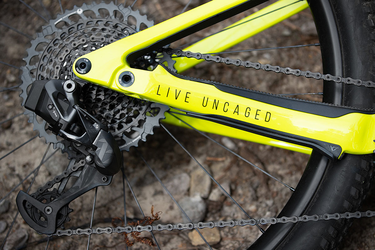 De YT Izzo Uncaged 7 deelt het frame met de andere Izzo-modellen. Daarmee is-ie dus ook volledig van carbon en een vierpunts veersysteem met Horst Link. Maar waar de overige modellen achteraan 130 mm veerweg hebben, heeft de Uncaged 7 er 120 mm. Die wordt in bedwang gehouden door een RockShox Sidluxe Ultimate achterdemper. Vooraan vind je een RockShox Sid Ultimate voorvork met eveneens 120 mm veerweg. Beide veerelementen kunnen – voor wie daar behoefte toe heeft – vanaf het stuur geblokkeerd worden met een RockShox Twistloc. Want waar de mountainbikes van YT typisch vooral toegespitst zijn op afdalen, mikt het merk met de Izzo Uncaged 7 dus op bikers die óók rap omhoog willen.
