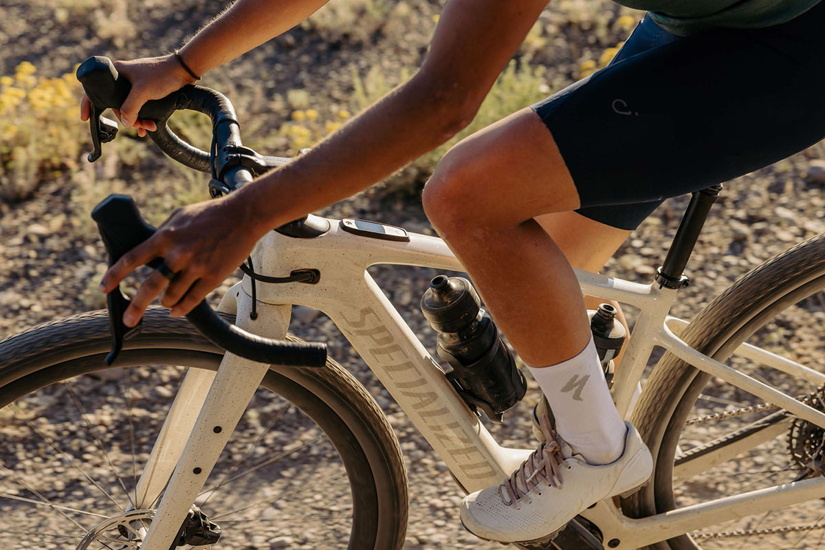 Specialized claimt dat de motor veel efficiënter is dan concurrerende compacte motoren en dus langer doet met een acculading. Over die accu gesproken: in deze tweede generatie van de Turbo Creo heb je altijd een 320 wattuur batterij in de onderbuis. Die is uit te breiden met een range extender met nog eens 160 wattuur aan capaciteit. Verder is het geluidsniveau verlaagd en is de Q-factor van de cranks met 12 millimeter verkleind. Dat betekent dus dat de cranks dichter bij het frame staan, wat met name voor compacte bikers met korte benen een stuk ergonomischer is voor de knieën.