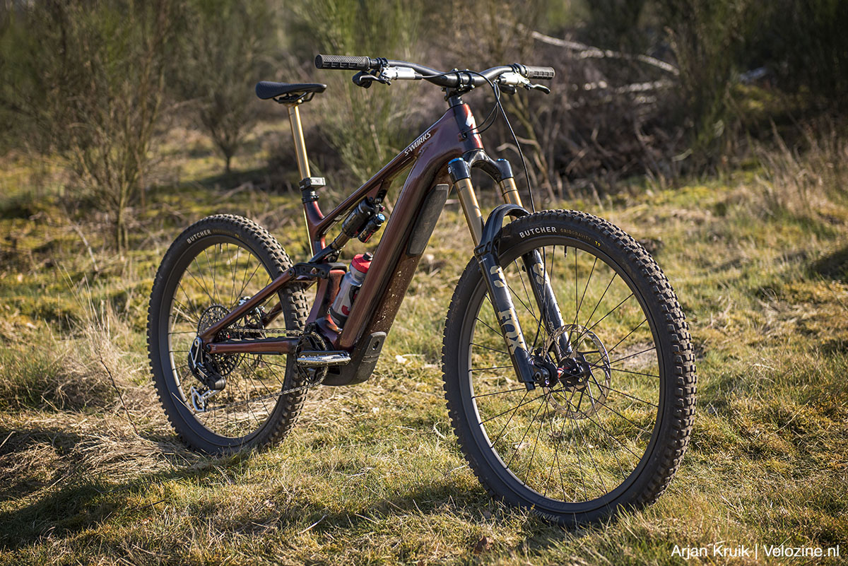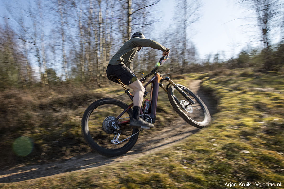 Voorafgaand aan de officiële lancering hadden Sebastiaan en ik de gelegenheid om ons een middagje met twee Turbo Levo’s uit te leven op Kwintelooijen. Alhoewel de hoogteverschillen er gering zijn, is Kwintelooijen vanwege z’n steile beklimmingen en veeleisende wortelsecties een fijn rondje om bikes à la Levo aan de tand te voelen. De aubergine-kleurige uitvoering die je op de foto’s ziet is de S-Works, met de getunede S-Works 3.1-motor die beschikt over 720 watt piekvermogen en een koppel van 111 newtonmeter. De andere testbike was een Levo Pro met gewone 3.1-motor met 666 watt en 101 newtonmeter. Ander verschil: we reden de Levo S-Works in maat S4 en de Levo Pro in maat S3.