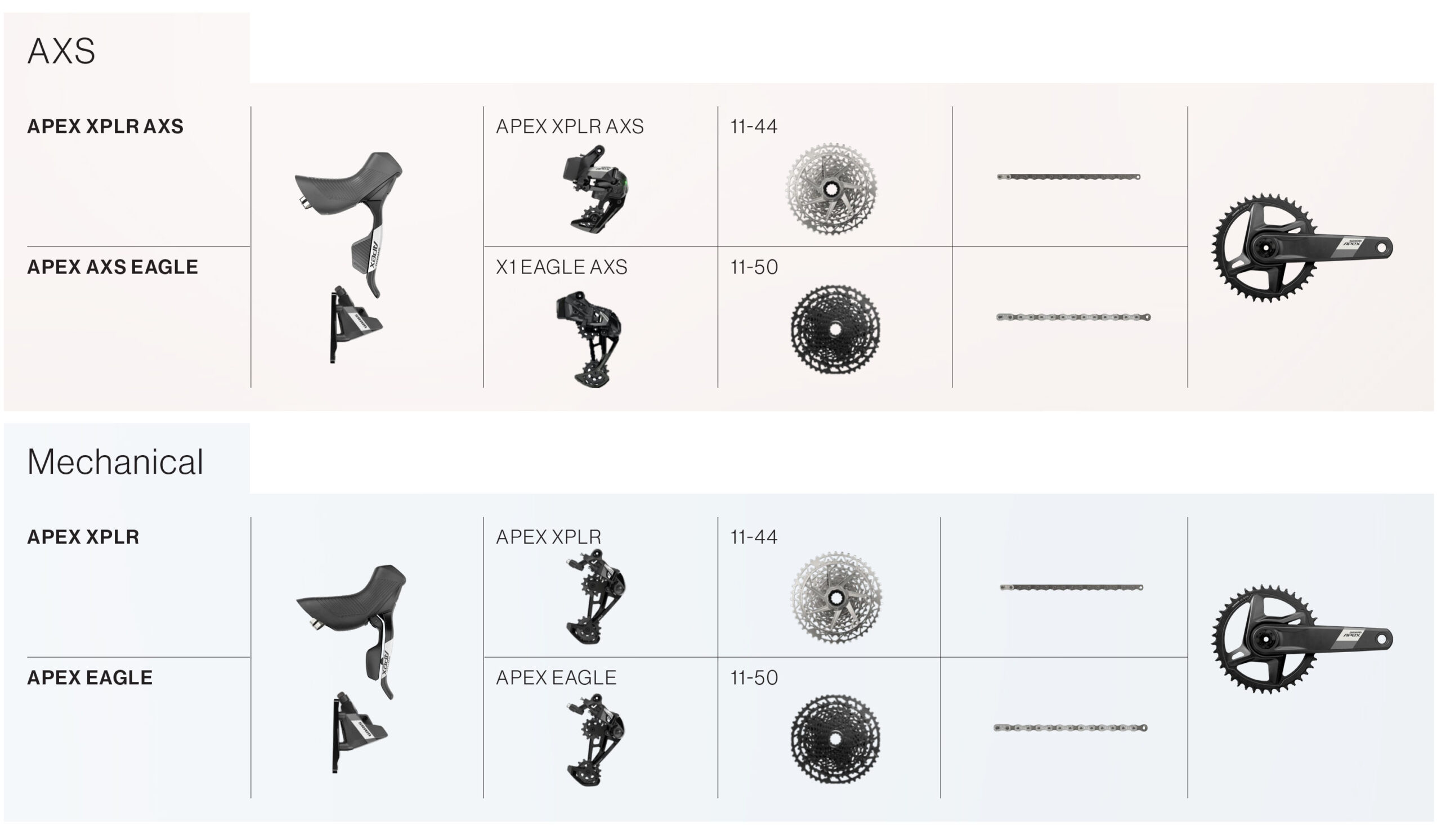 Bij zowel Apex AXS als Apex mechanisch heb je de keuze uit XPLR- en Eagle-cassettes. Sram zet de vernieuwde Apex-familie neer als de meest intuïtieve schakelgroep voor alles van toerfietsen tot racefietsen en alles daar tussenin: