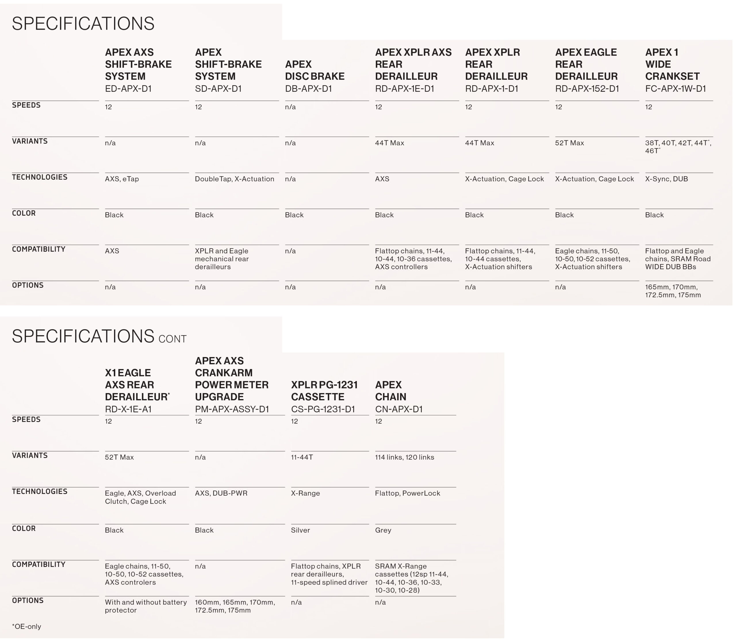 De Apex-cranks hebben aluminium armen en een DUB-aluminium trapas. In feite zijn het gewoon Rival-cranks, maar is er op kosten bespaard door ze vóór het zwart anodiseren niet te polijsten. De kettingbladen komen eveneens één-op-één uit het schap van de Rival-groep. Ze zijn van aluminium en worden gemonteerd volgens het direct mount principe met 8 bouten. Er is een keuze uit 38 tanden tot en met 46 tanden. Voor fietsfabrikanten is er ook een 40-tands stalen kettingblad optie. Alle kettingbladen hebben het X-Sync tandprofiel, dat – opvallend genoeg en in tegenstelling tot XPLR en Eagle-cassettes – compatibel is met zowel de Flattop als Eagle-kettingen.