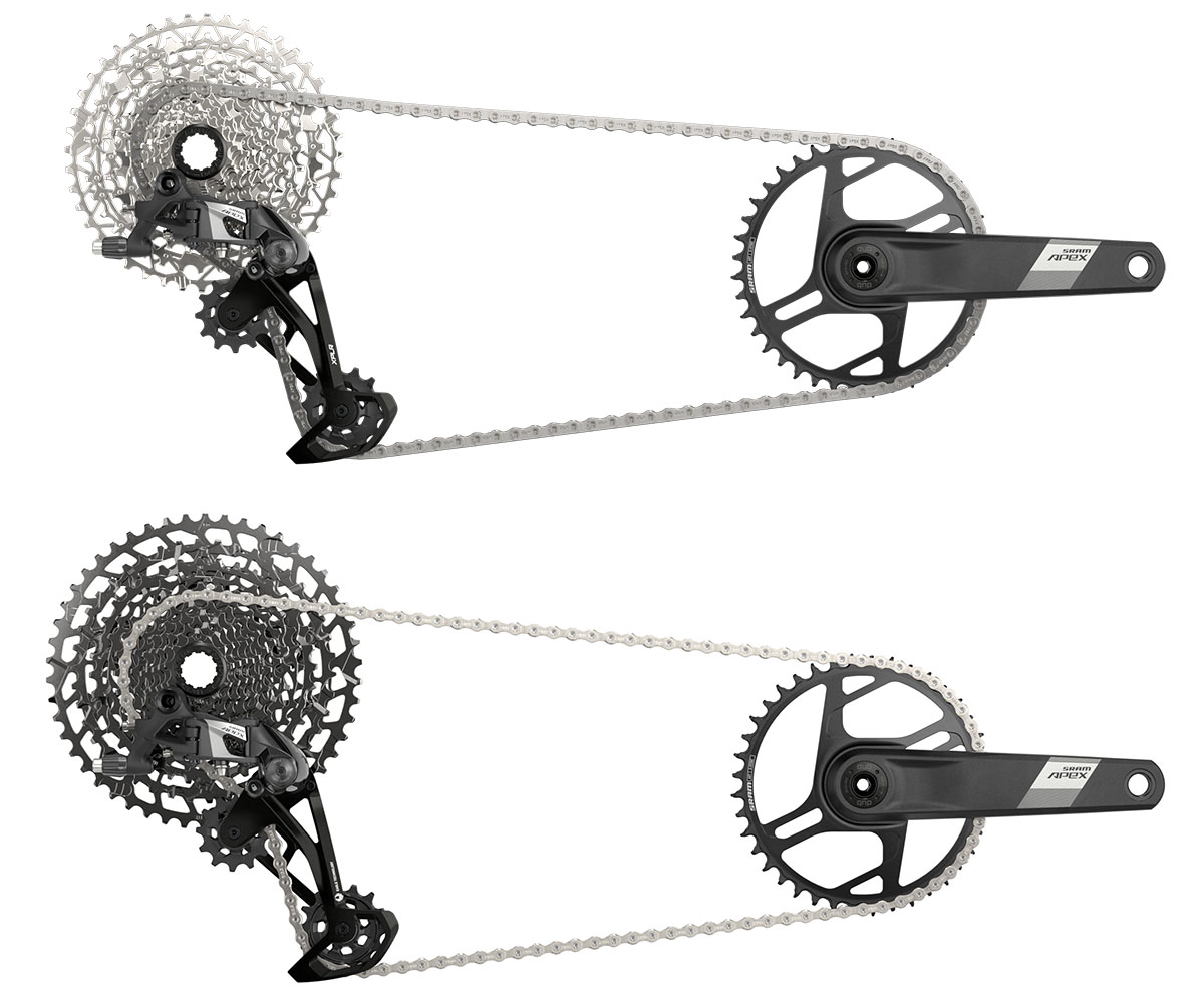 Net als bij Apex AXS heb je de mechanische Apex 12-speed groep de keuze uit het grote bereik van de 11-44t XPLR-cassette met Flattop-ketting en het nóg grotere bereik van de 10-50t of 10-52t-cassettes en bijbehorende kettingen uit de Eagle-groepen. Daartoe heeft Sram nu een Apex XPLR-derailleur én een Apex Eagle-derailleur, waarbij het verschil hem zit in ‘vin’ onderop de derailleur, waarover de schakelkabel loopt. Die bepaalt de verhouding tussen de mate van kabel- en derailleurverstelling. En blijkbaar is de afstand tussen de kransjes op een XPLR- en Eagle-cassette dus voldoende afwijkend om hier twee varianten voor te moeten maken. Ook zijn de derailleurwieltjes anders; bij de XPLR-variant zijn ze afgestemd op de Flattop-ketting die je gebruikt bij de XPLR-cassette.