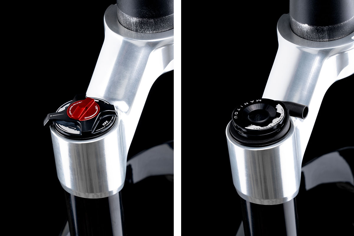 Manitou heeft z’n demper drie circuits gegeven. Bovenop de vorkkroon biedt de zwarte draaiknop drie standen voor de compressiedemping. De derde positie is een lockout, waarbij Manitou bewust een eigen klep gebruikt om de compressiedemping dicht te zetten. Dit laat toe om een in te stellen compressiedemping te maken die géén rekening hoeft te houden met de volledige lockout. Simpel gesteld kan hierdoor het te verstellen circuit fijngevoeliger en nuttiger worden benut.