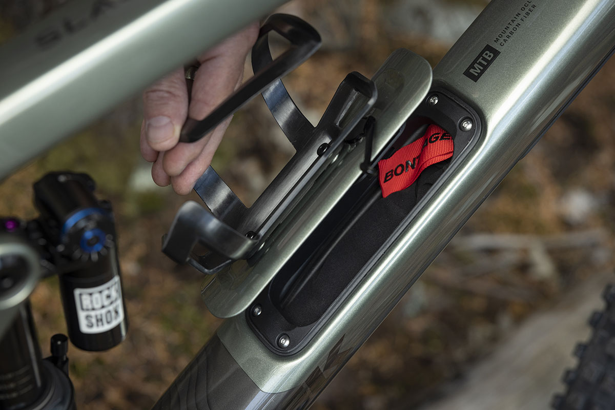 Trek zet de 2024 Slash neer met carbon én aluminium frames. Bij de carbon frames zijn ook de liggende en staande achtervork van carbon. Rondom zijn de frames flink ingepakt met rubber. Niet alleen de liggende achtervork, maar ook de onderbuis om de bike óók te beschermen tijdens het ‘shuttlen’. Verder meldt Trek dat de nieuwe 2024-Slash in alle framematen voor veruit de meeste bikers ruimte bied voor een dropper-zadelpen met een droplengte 170 millimeter. Tot slot hebben alle Slash-frames, dus óók (en dat is nog steeds behoorlijk uniek) de aluminium versies een opbergvak in de onderbuis.