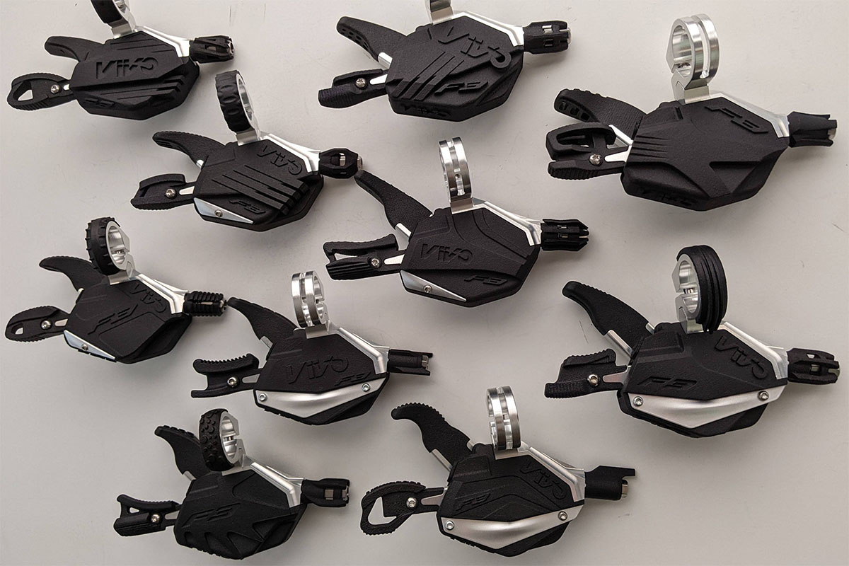 Het hart van de Vivo F3 shifter is een mechanische schakelaar met twee hendels met eenzelfde soort bedienlogica als de mechanische shifters van Shimano. Je hebt dus twee hendels, waarbij de onderste gebruikt wordt om de kabel te spannen (naar grotere krans schakelen). De bovenste hendel kan naar voren én naar achteren geduwd worden om naar een kleinere krans te schakelen. Daarmee houden de gelijkenissen wel op. Want je kunt deze shifter samenstellen met een grote keuze aan behuizingen en beschermplaat voor de klemband voor de montage van de shifter op je stuur. En zelfs voor de kabelversteller biedt Vivo Sports je alleen al negen opties. Waarom? Het simpele antwoord: omdat het kan. Of beter: omdat het dankzij 3D-printtechniek erg eenvoudig is om varianten aan te bieden.