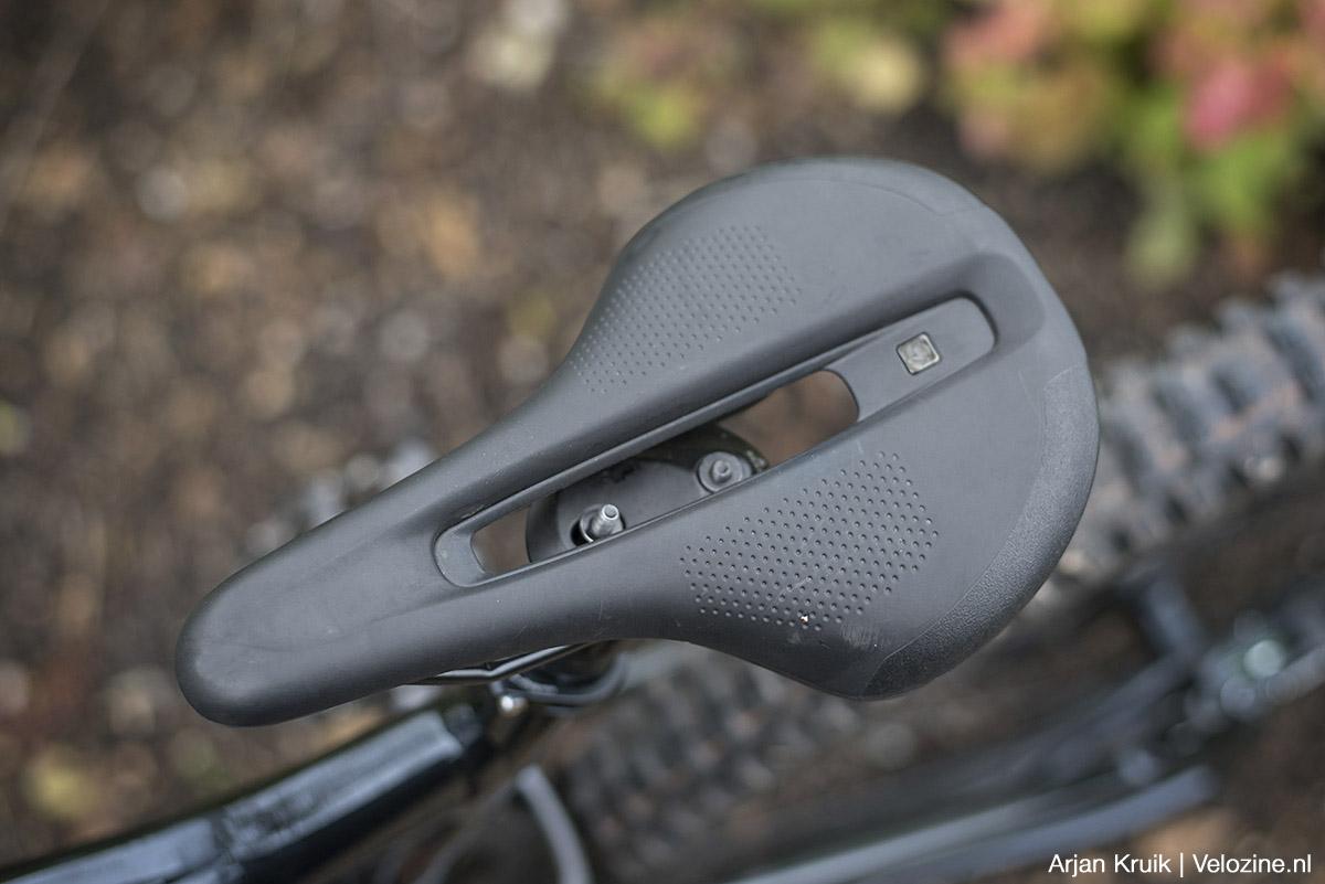 Nog even wat specs: de rails zijn van hol roestvast staal, de schaal van kunststof. Het zadeldek is van kunstleer dat in het midden is uitgevoerd met een gaatjespatroon. Het materiaal is duidelijk gladder dan dat van de lange Bontrager Verse. Aan de randen is het zadeldek verstevigd ter bescherming tegen valpartijen.