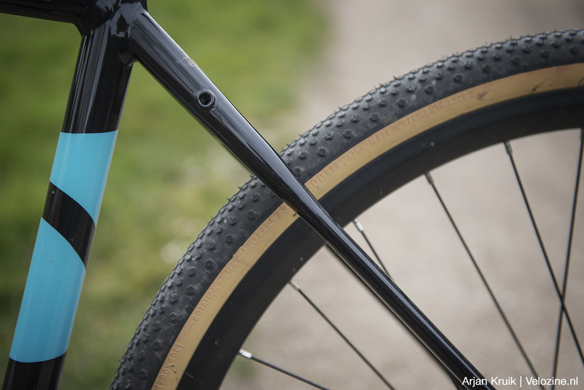 Desondanks zijn de wielen de achilleshiel van de Conway GRV 6.0. Dat is met name te wijten aan de velgen van het Franse merk Mach 1. Los van hun relatief hoge gewicht zijn ze ook smal (19 mm intern) en hoog (29 mm). Vanwege die geringe breedte staan de Conti Terra Speeds er minder mooi op. En de grote velghoogte levert een stug wiel op, dat in combinatie met de 32 ongebutte spaken als dat nodig is maar zeer matig meegeeft. Dat betekent dat de band ál het werk moet doen als het gaat om het opvangen van oneffenheden. En nu ik het toch over comfort heb: ook de aluminium zadelpen geeft, ondanks z’n geringe diameter, onregelmatigheden in de ondergrond vrijwel ongefilterd door aan het zitvlak van de berijder. Geen nood: met een carbon comfortpen kan op dit vlak voor slechts een geringe investering heel veel winst behaald worden.