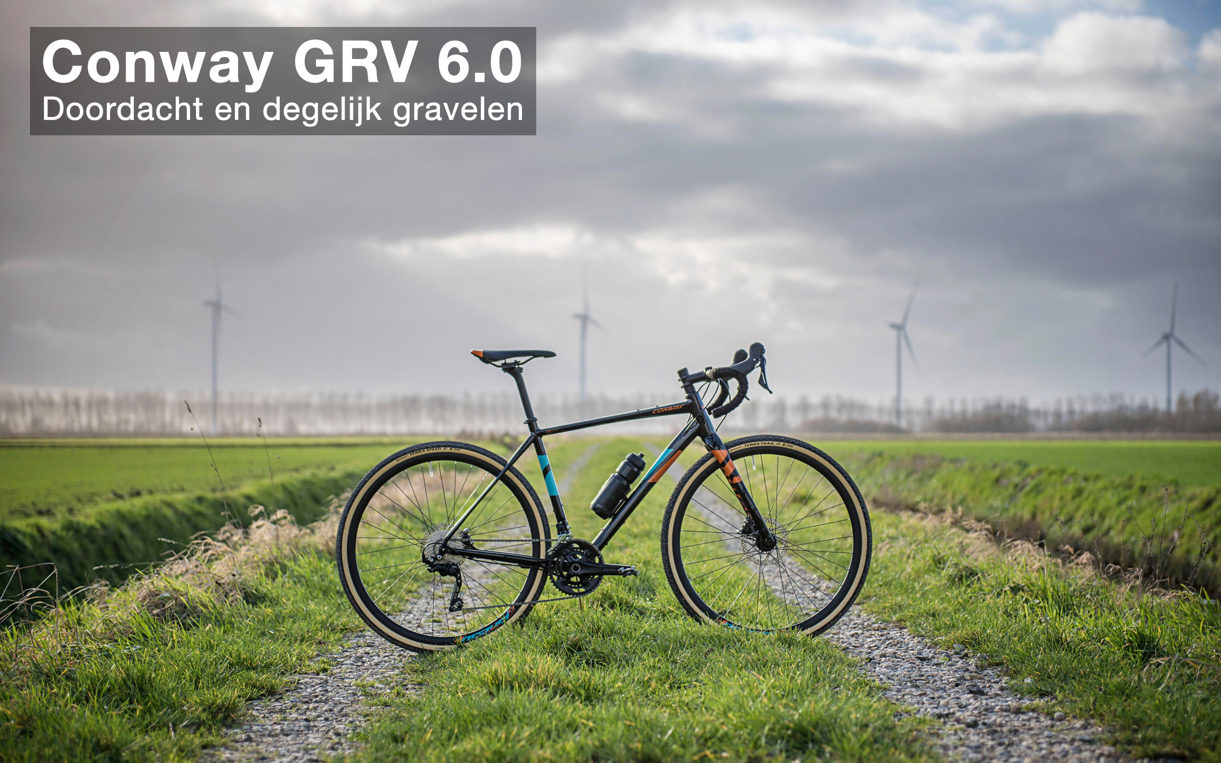 “Gravelbikes worden steeds populairder. En terecht! Het zijn heuse allrounders die snelheid koppelen aan betrouwbaarheid en brede inzetbaarheid. Onze GRV-serie gooit hoge ogen met zijn vele montagepunten voor fietstassen en bevestigingssystemen, een vernieuwde carbon voorvork en een aangename geometrie tegen een voordelige prijs”, zo introduceert het Duitse merk Conway z’n nieuwe GRV-modelreeks. Prima omschrijving, lijkt mij. Want dat is wat een gravelbike in mijn optiek zou moeten zijn: een allrounder waarmee bijna niks niet kan. Asfalt, klinkers en onverharde wegen en paden. Toeren, trainen en avonturen beleven. In de polder, in het bos en in het buitenland. Zonder tijdwaarneming of juist met.
