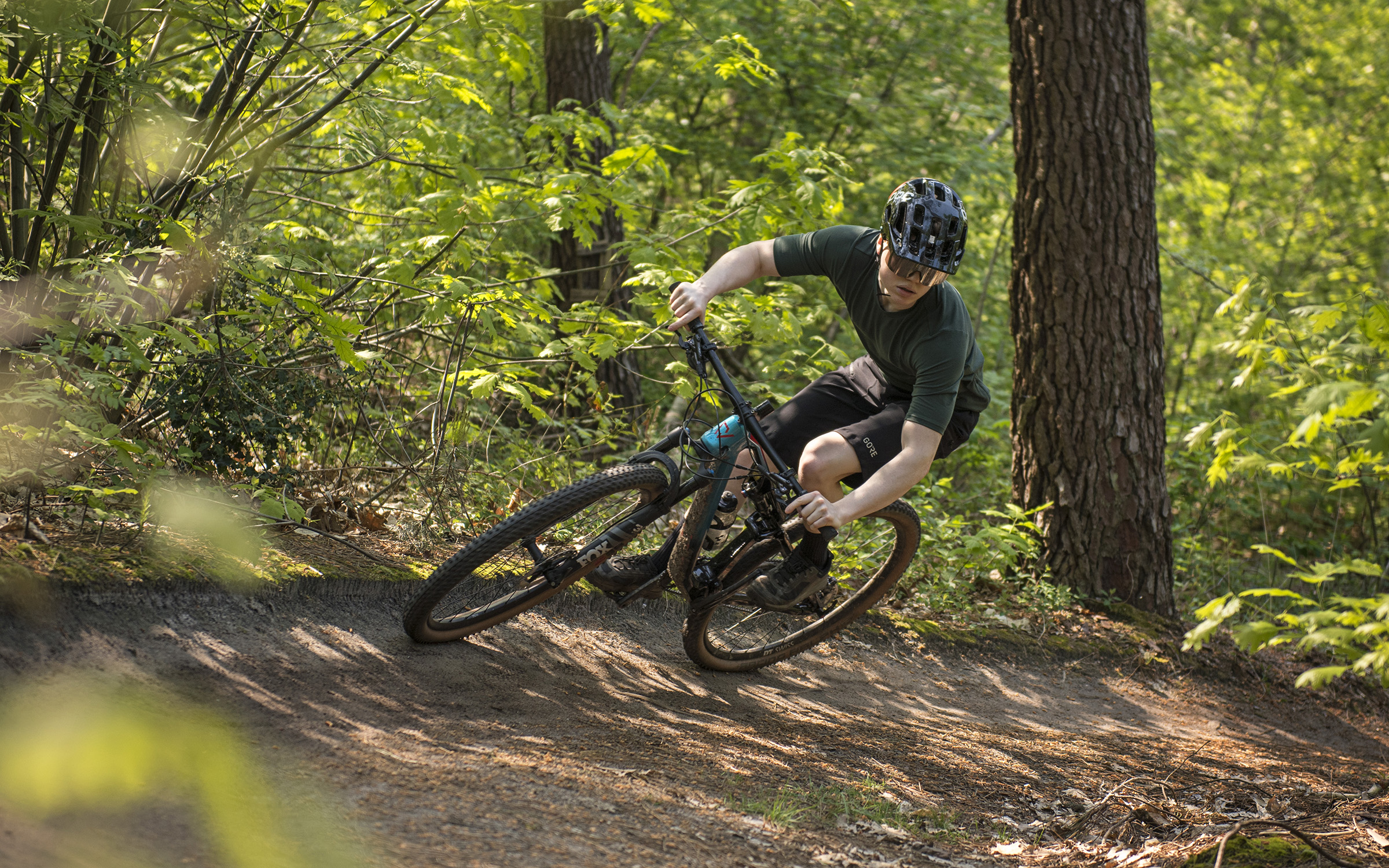 Ook de stuurprecisie is ronduit goed; hier blijkt dat de Fox 34 Step-Cast op het vlak van stijfheid in een heel andere divisie speelt dan de Fox 32 Step-Cast in de Conway RLC FS 6 die we in 2021 testten. Plus: de twee centimeter extra veerweg – en de iets luiere balhoofdbuishoek die dat oplevert – komen op de Heuvelrug veel meer van pas dan op m’n vaste Brabantse rondjes. Als de Heuvelrug jouw habitat is, dan is de 120 millimeter voorvork dus zeker niet misplaatst. M’n indruk dat deze fully zich bovengemiddeld efficiënt omhoog laat peddelen blijft op de Heuvelrug overeind. Wat een klimkoning! En dat met de standaard, relatief zware systeemwielen. Kan je nagaan waartoe deze bike in staat is met een setje lichtgewicht carbon hoepels…