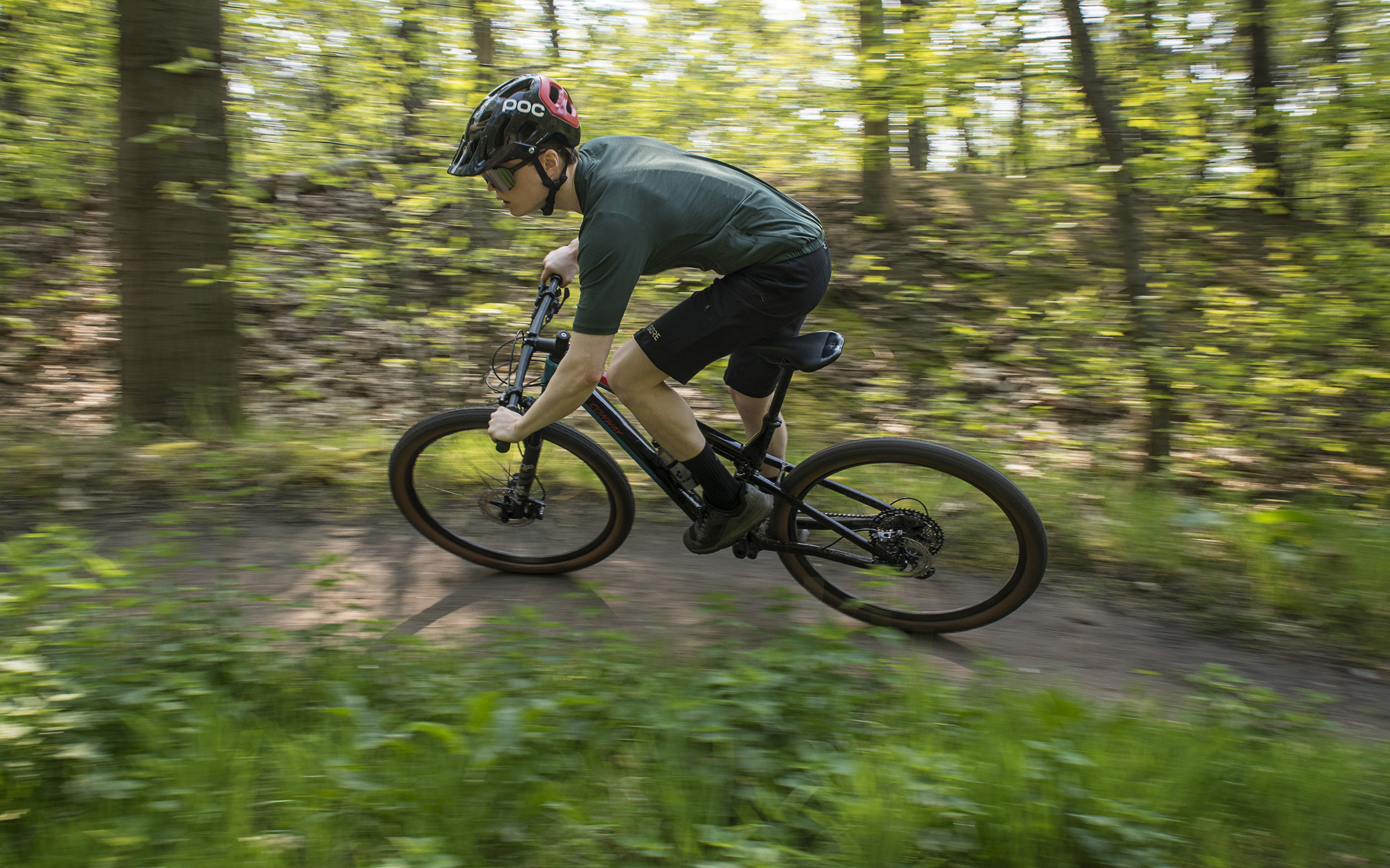 Goed, dan nu het rijden met de Conway RLC FS 6.9. Ik heb ‘m voornamelijk gebruikt op mtb-routes in het westen van Brabant. Drieluik Dorst, Bergen op Zoom, Huijbergen, dat soort routes. Maar daarnaast is de Conway ook mee geweest naar de Utrechtse Heuvelrug. Over de gestrekte zitpositie heb ik het al uitgebreid gehad. Vind je die fijn, dan hoef je er niets aan te doen, zit je graag wat compacter, dan is dat met een andere stuur- en zadelpen snel opgelost. Ik ben zelf met de orginele set-up blijven rijden, maar wel met het zadel maximaal naar voren geschoven.