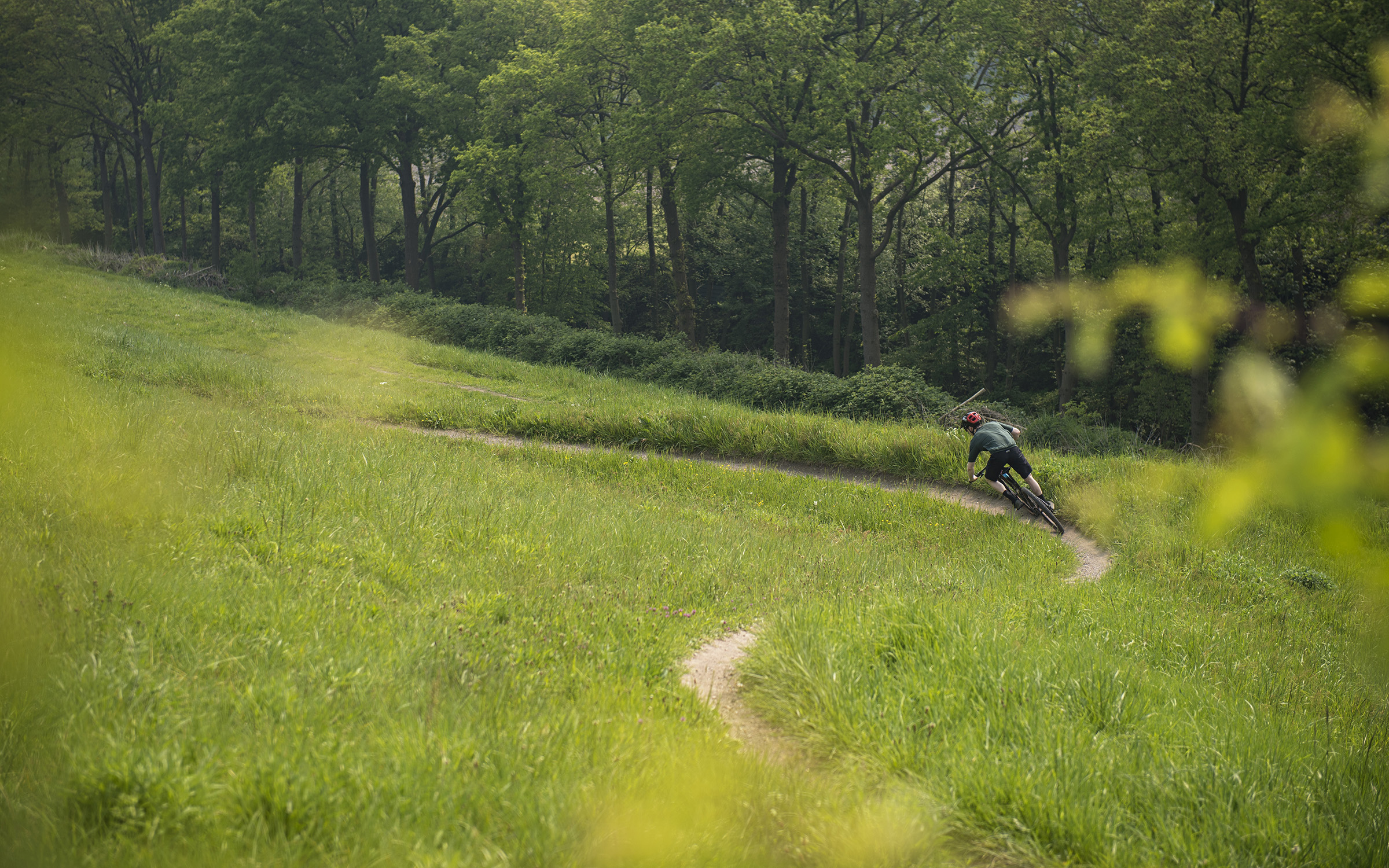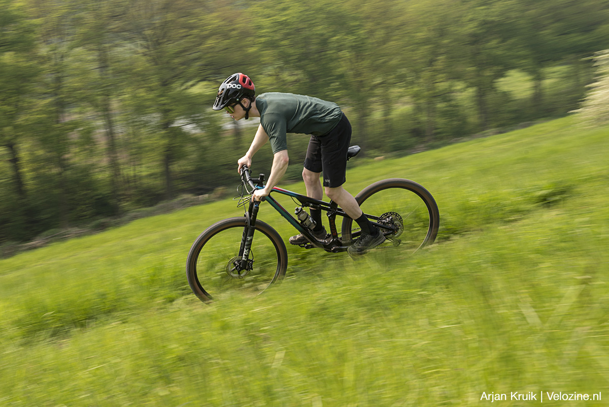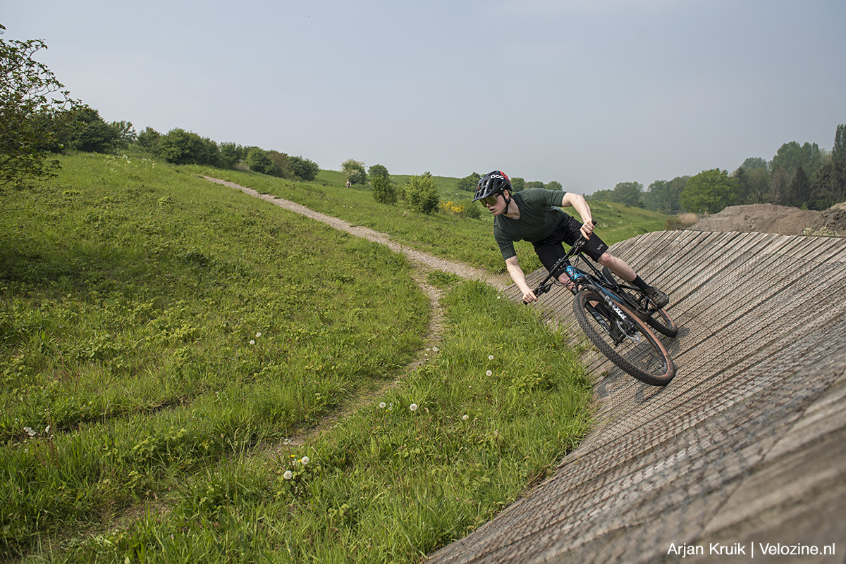 Op die manier afgesteld klimt deze dubbelgeveerde Duitser echt fantastisch, met name als je op het zadel blijft zitten. Het voorwiel blijft de ondergrond goed volgen en de achterkant grossiert in grip. Op Col du Kragge, de route op de voormalige vuilnisbelt De Kragge bij Bergen op Zoom, is dat een enorm pluspunt. De beklimmingen zijn daar namelijk steil tot zeer steil, terwijl de ondergrond bestaat uit fijn grind. Niet bepaald een combinatie die garant staat voor veel tractie, maar de Conway heeft er maar weinig moeite mee.