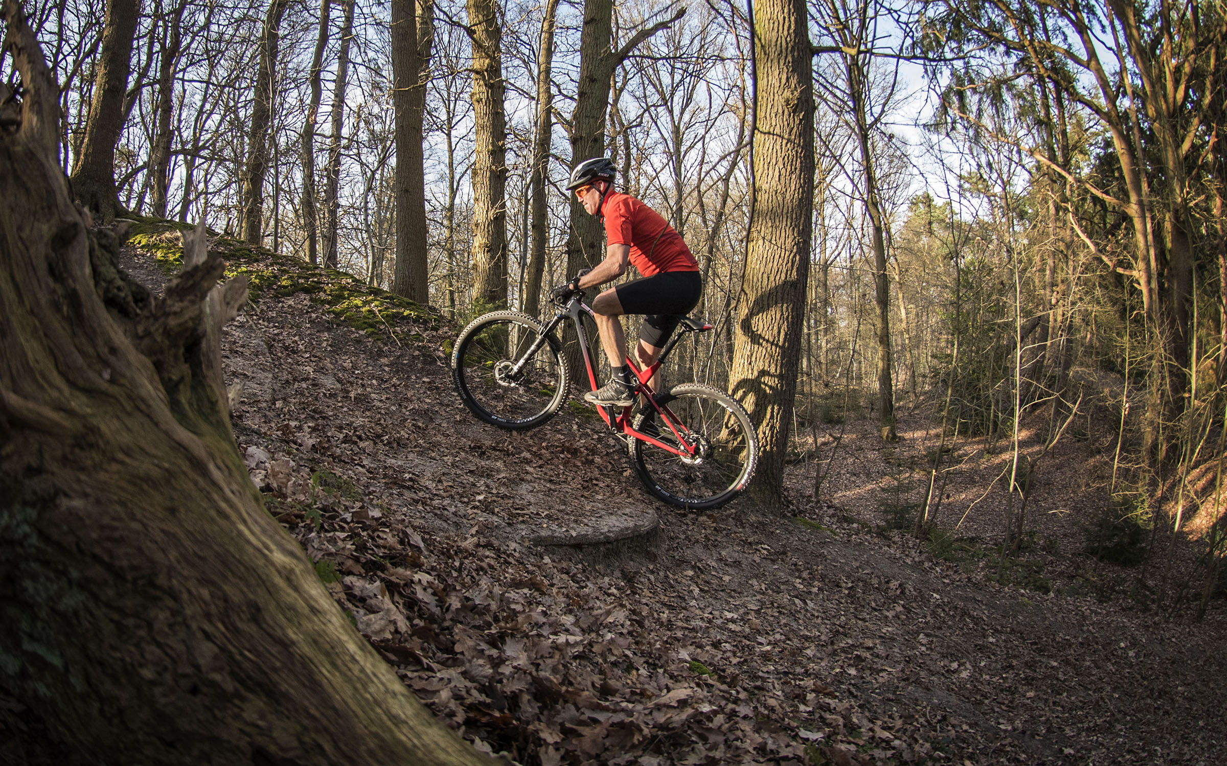 In de relatief lange beklimmingen op deze voormalige vuilnisbelt, die ik grotendeels zittend op het zadel overmeester, blijkt de achtervering nauwelijks gevoelig voor deinen. Inzakken van de achtervering in de steilste secties? Nauwelijks. Het voorwiel blijft bovendien mooi aan de grond, met dank aan de relatief lange achterbrug en de korte balhoofdbuis. Zelfs in de korte maar steile klimmetjes in de aansluitende route door bos, die ik wel voornamelijk staand in de pedalen neem, houdt de achtervering zich prettig koest. Het is een afgekloven cliché, maar door z’n directheid en sportiviteit waan ik me op de Conway RLC FS echt de King of the Kragge!