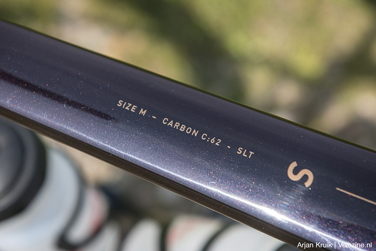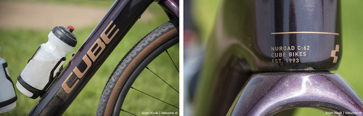 Onze testfiets in maat M weegt 12,9 kilo, inclusief motor en accu. Dat is licht voor een gravelbike met trapondersteuning. Maar bedenk wel dat onze testfiets, de Nuroad Hybrid SLT, de duurste uitvoering is, met een keur aan lichtgewicht onderdelen. Aan de andere kant, het goedkoopste model, de Nuroad Hybrid Race, weegt met 14,3 kilo niet héél veel meer. Naast de lichte Bosch SX-motor en dito accu – waarover straks meer – komt een belangrijk deel van dat lage gewicht op het conto van het frame. Dat is gemaakt van Cube’s hoogwaardige C:62-carbon en weegt volgens de Duitse fabrikant inclusief de vork nog geen 2 kilo. Niet superlicht voor een reguliere gravelbike van carbon, maar wel voor een exemplaar dat een motor en een accu moet huisvesten.