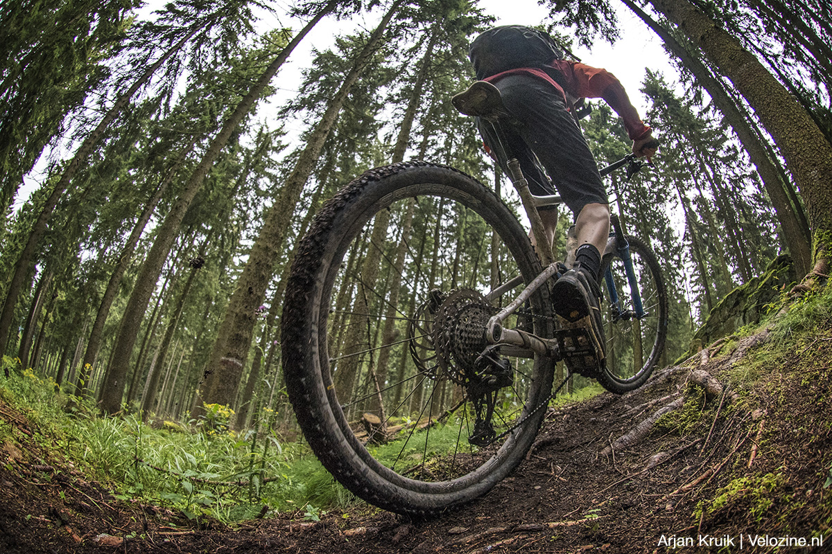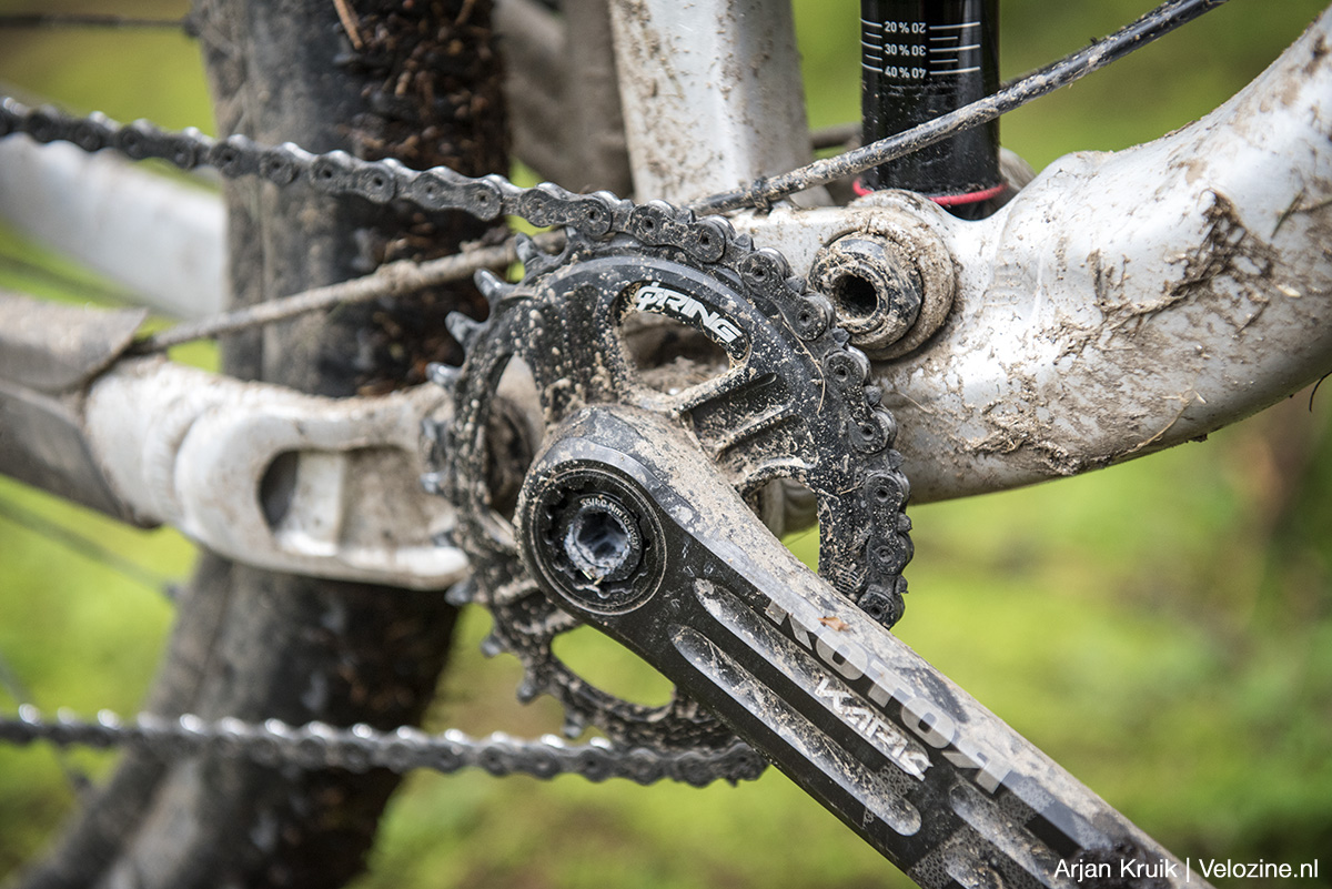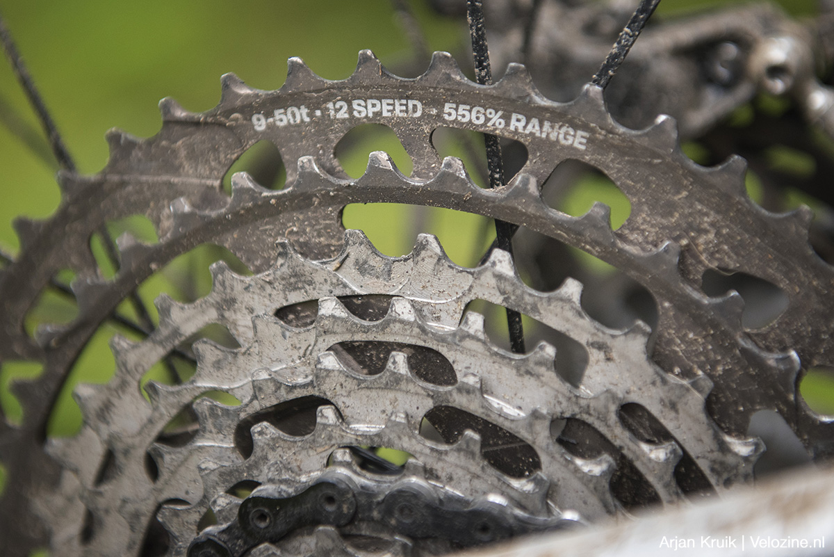 En dat is dus precies wat ik gedaan heb, het bos in. Sram GX-cassette en -ketting eraf, Helix R12 en een nieuwe Sram X01 Eagle PC 1290-ketting erop. Plus een nieuw kettingblad, een 30er in plaats van de originele 32er. Wat blijft is de Sram GX-derailleur en de GX-schakelaar. Met deze set-up heb ik vervolgens heb ik een kleine 1.500 kilometer en 15.000 hoogtemeters gereden, waarvan – zoals ik hierboven al schreef – een behoorlijk deel nátte kilometers.
