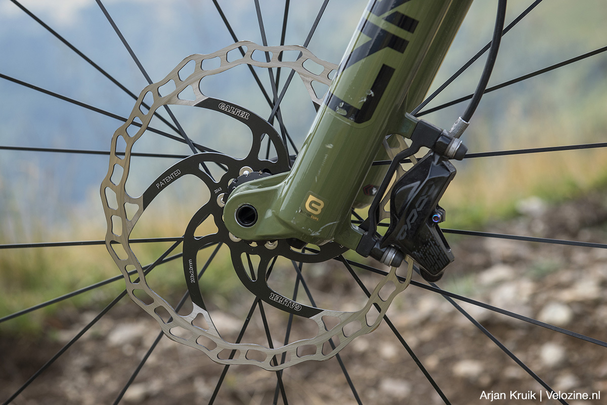 Wat het ook is, bij Galfer vond ik naast remblokken ook een set 203 mm Wave-remschijven met een dikte van 2,0 mm. Zo’n dikkerd uit Barcelona kost een tientje extra ten opzichte van een 1,8 mm uitvoering van hetzelfde merk en weegt 40 gram meer. Maar weer 20 gram mínder dan een 200 mm Centerline-schijf van Sram, wat wellicht verklaard wordt door de meer open structuur van het remoppervlak van de Galfer-remschijven. Prettig, dat lage gewicht. Maar hopelijk gaat het niet ten koste van de remkracht en de warmtebeheersing…