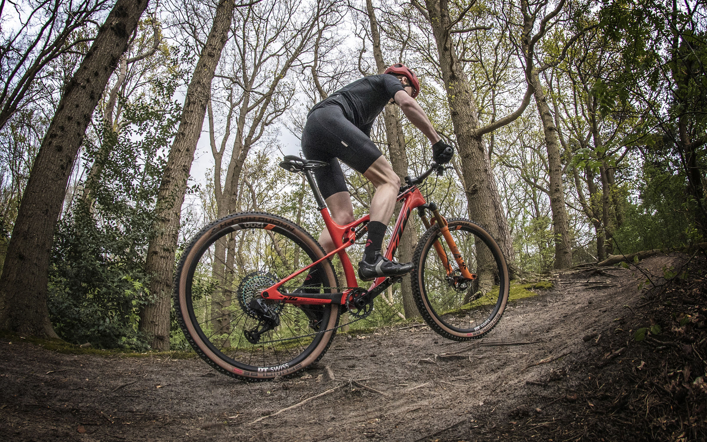 De basis van de KTM Scarp Exonic is een carbon frame van net iets minder dan 1.600 gram, dat is volgehangen met alles dat mooi, licht en duur is. De Sram XX1 Eagle AXS aandrijflijn is het meest spraakmakend. Letterlijk, want omdat ze maar spaarzaam in het wild rondrijden is de draadloos schakelende derailleur een geheid onderwerp van gesprek. Maar hoe fraai deze elektrische schakelgroep ook is, de vederlichte XRC 1200-wielen van DT Swiss hebben een veel grotere impact op de rijeigenschappen. Compleet met banden, remschijven en cassette weegt deze wielset namelijk slechts 3,59 kg! En dat betekent dat de Scarp Exonic accelereert als Vin ‘Fast & Furious’ Diesel die een stoot lachgas in de cilinders van z’n opgevoerde bolide injecteert.