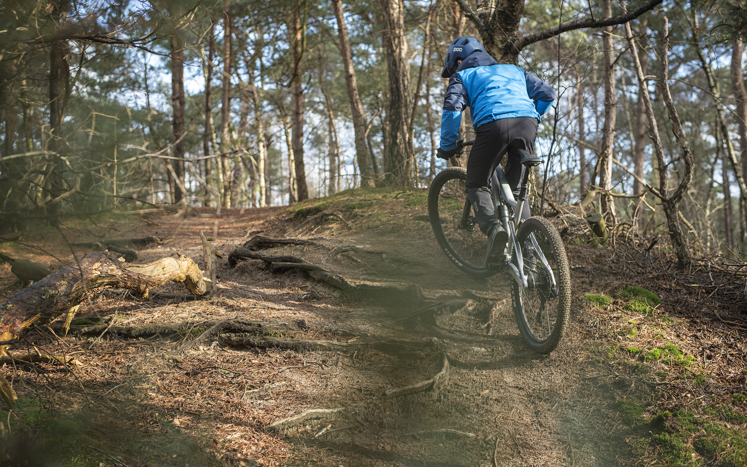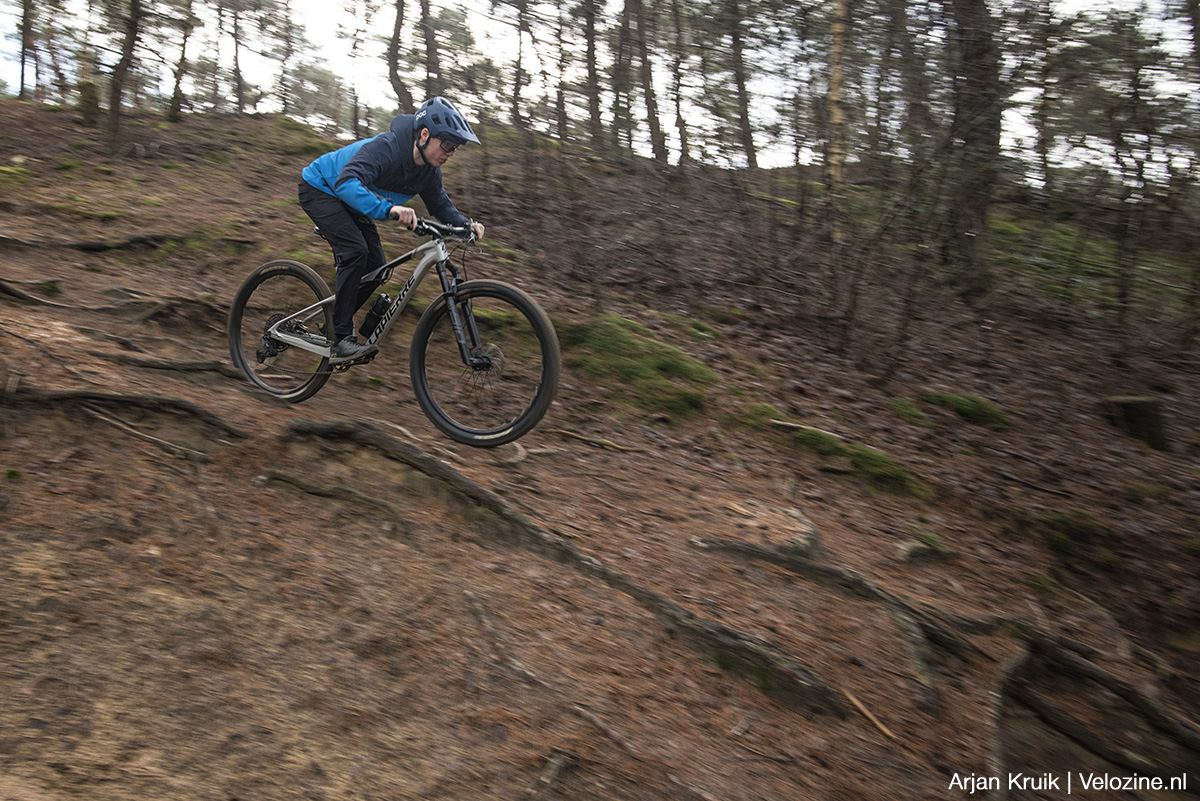 Ik mopperde hierboven over het ontbreken van een klimstand bij de veerelementen, maar de eerlijkheid gebied me te zeggen dat het onderstel van de XRM in de open stand nauwelijks gevoelig is voor deinen. Sterker: hoe harder ik op de pedalen stampt, hoe efficiënter het rijgevoel. De demper zakt in steile passages niet weg, maar reageert wel uitermate fijngevoelig op de ondergrond, waardoor de achterband ondanks z’n ondiepe profiel toch verrassend veel grip weet te vinden. Alleen op de voor Drieluik Dorst zo karakteristieke korte maar steile bulten, die ik voornamelijk staand in de pedalen overmeester, gaat de achtervering zo nu en dan door z’n knieën. Hier zou tussen de open en de gesloten stand een klimstand van pas komen. Immers; als je de vering ‘op slot zet’ lever je in op tractie en comfort. Ik gebruik de lock-out daarom alleen maar op de verbindende asfaltsecties.