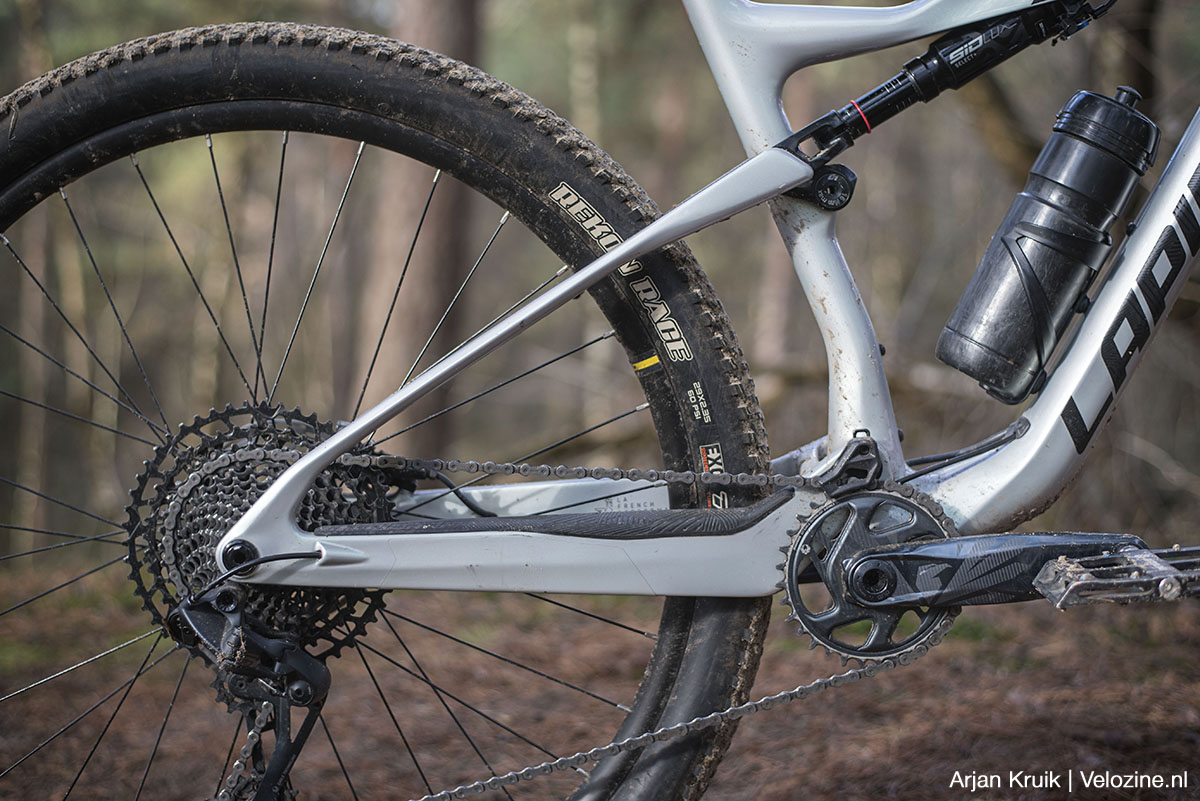 Lapierre past in de liggende achtervork van de XRM geen gelagerde Horst-link toe. De scharnierbeweging tussen de liggende en de staande achtervork die bij inveren van het achterwiel noodzakelijk is, komt uit het composietmateriaal zelf. Of meer specifiek: uit de staande achtervork. In tegenstelling tot de liggende achtervork is die niet doosvormig, maar juist extreem plat, waardoor het geheel functioneert als een bladveer. Meer hierover bij m’n beschrijving van het veersysteem.