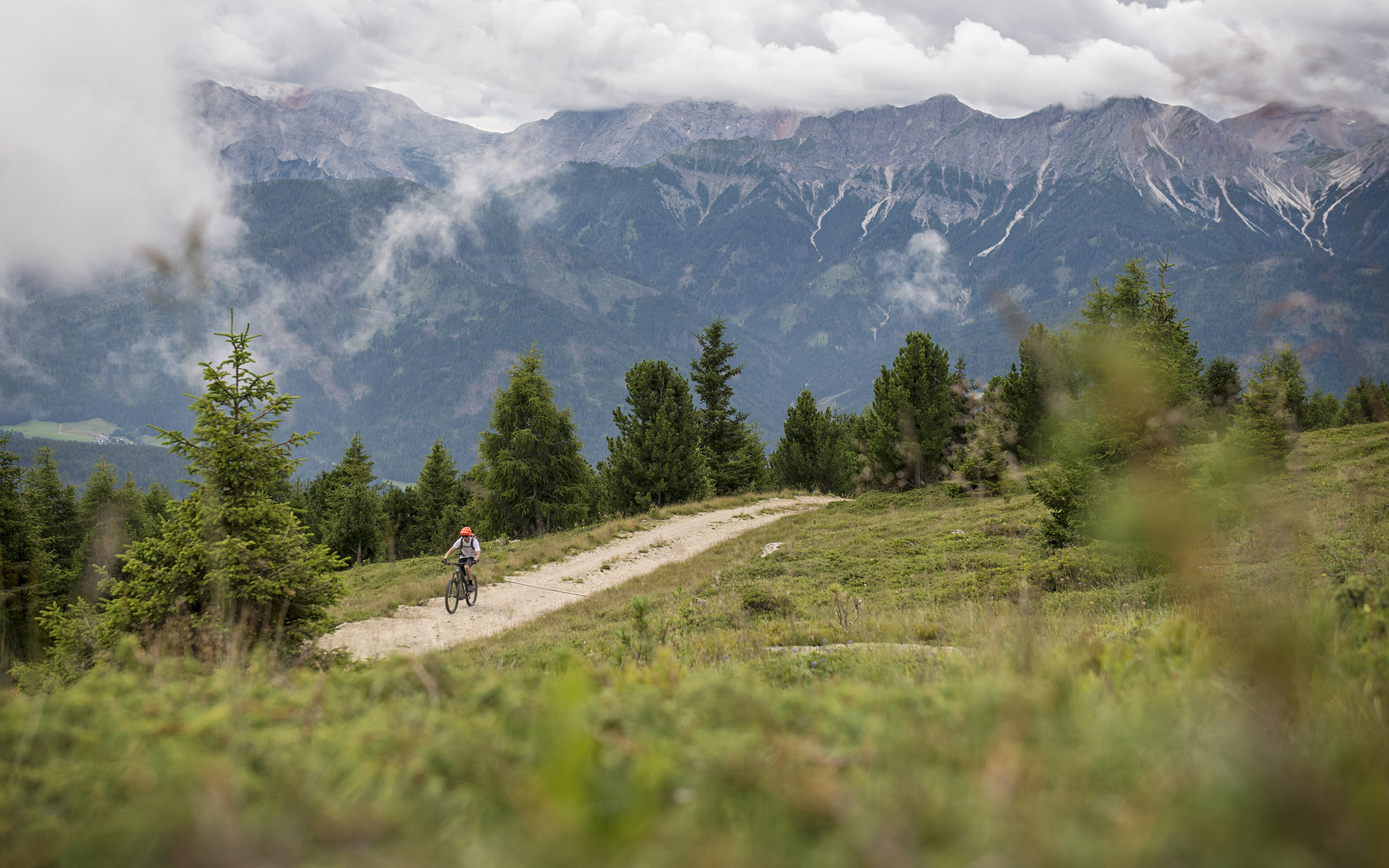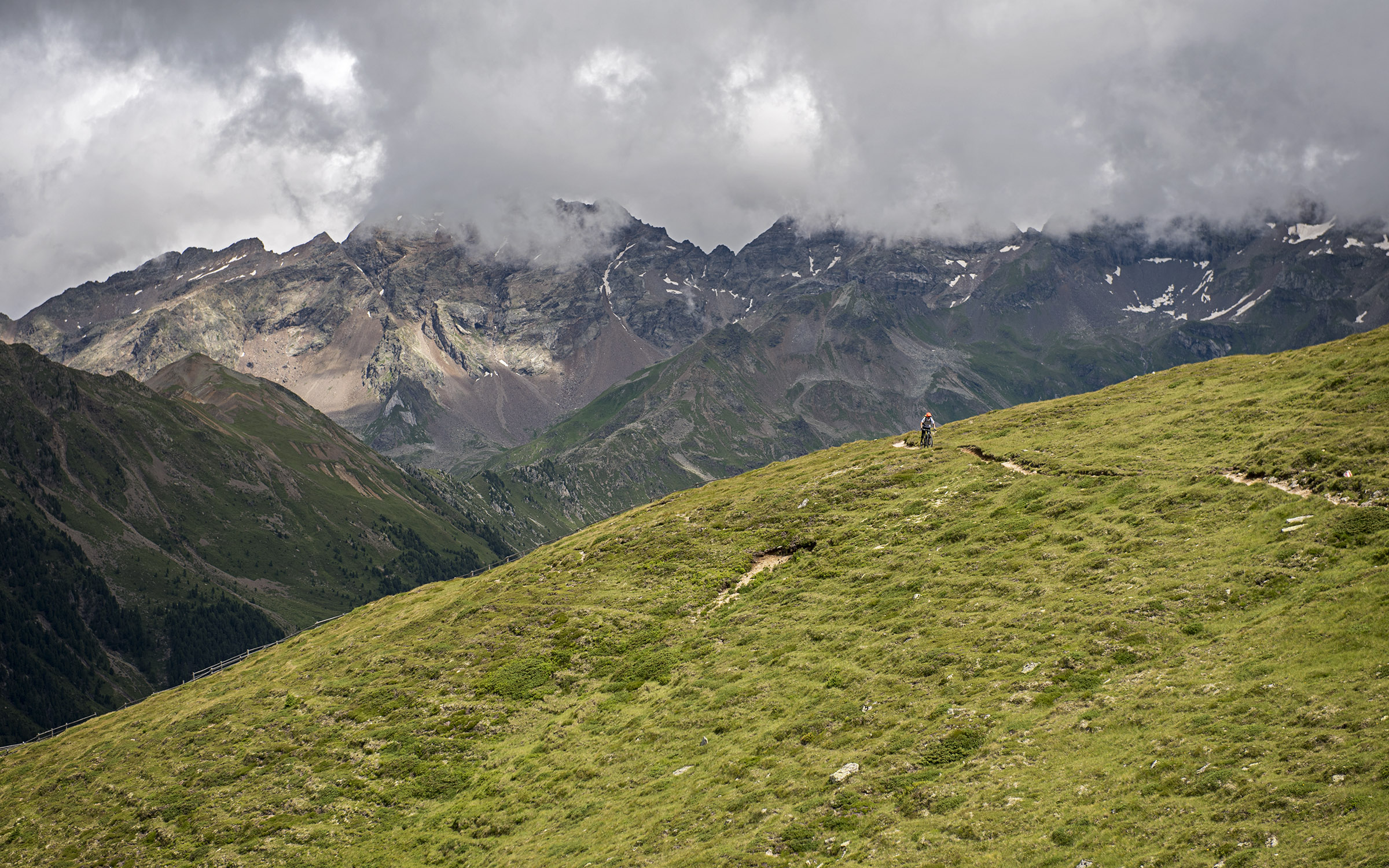 Boven de boomgrens gaat de schotterstraße over in een smalle en steile steig. Hier hetzelfde beeld als op het smalle pad beneden in het bos; ondersteuning, vering en geometrie resulteren gezamenlijk in verrassend goede klimeigenschappen. Dat wil zeggen: verrassend voor een bike met zoveel veerweg. Praktisch: Merida monteert cranks van 165 millimeter kort, waardoor de pedalen minder snel blijven hangen. In het diep uitgesleten pad naar de top van de Hochnall is dat een niet te onderschatten voordeel.