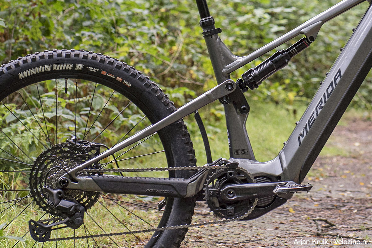 De Merida eOne-Sixty heeft, in tegenstelling tot wat de naam suggereert, geen 160 millimeter veerweg rondom, maar 170 millimeter. Achter worden de klappen opgevangen door een Rockshox Super Deluxe Select. Die laatste aanduiding geeft aan dat we hier te maken hebben met een qua binnenwerk relatief eenvoudig exemplaar, met uitsluitende een instelbare rebound. Dat blijkt in de praktijk geen probleem: de fabrieksafstelling van de compressiedemping is voor mijn rijstijl gewoon goed. Merk op dat de demper een kwartslag gedraaid is opgehangen, waardoor het externe oliereservoir, de piggy back, niet in de weg zit van een eventueel te gebruiken range extender.
