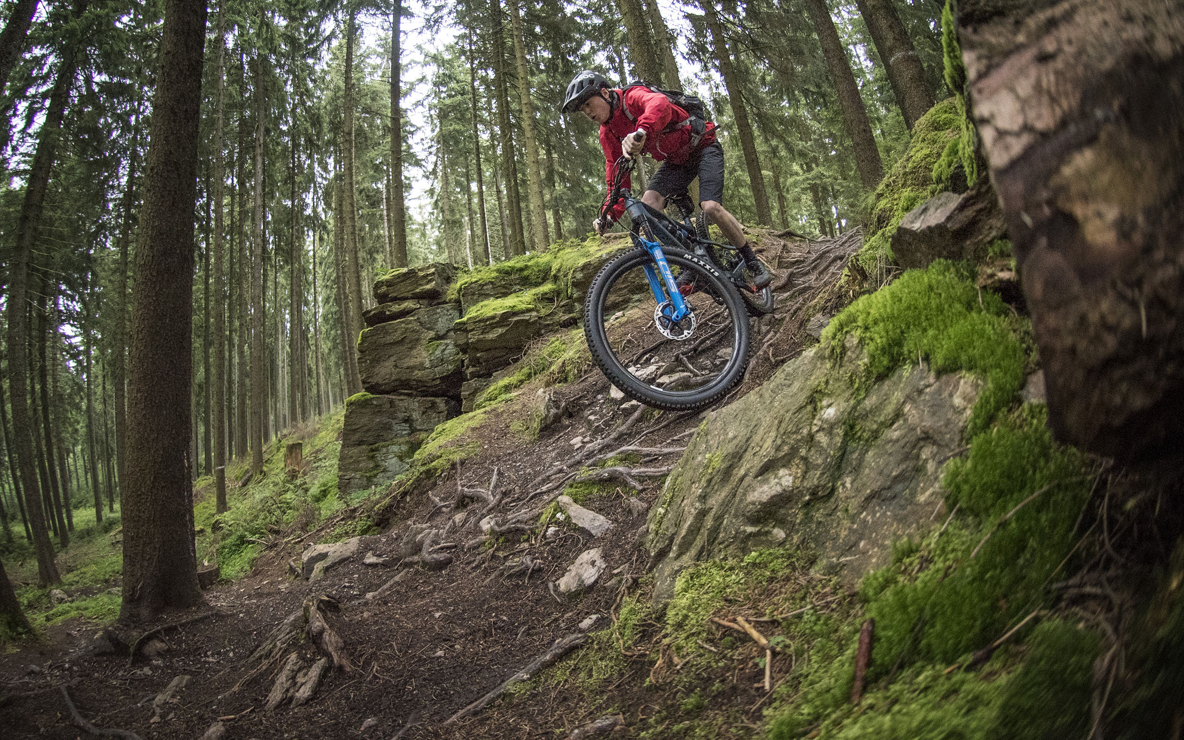 “...de listige zwarte afdalingen die ik later in Trailcenter Rabenberg overmeester, bevestigen de eerste indruk: wat is déze bike capabel als het pad omlaag gaat!”