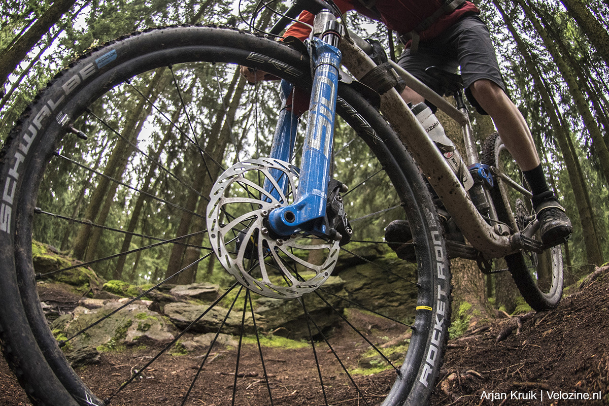Iedere keer weer trap ik weer in dezelfde valkuil; remmen die het op Nederlandse parkoersen prima lijken te doen, vallen op lange en steile buitenlandse afdalingen toch vaak door de mand. Zo ook de Sram G2-schijfremmen op mijn Giant Anthem. Tijdens het rijden van de Stoneman Arduenna blijken de remkracht en hittebestendigheid onvoldoende. Niet alleen moet ik bovengemiddeld hard in de remhendels knijpen om voldoende te kunnen vertragen, maar ook sluit ik de langste en steilste afdaling voortdurend af met dampende en stinkende remmen. Terwijl ik uit voorzorg rondom relatief grote 180 mm remschijven heb gemonteerd. En ik inclusief rugzak toch echt niet boven de 80 kilo uit kom.