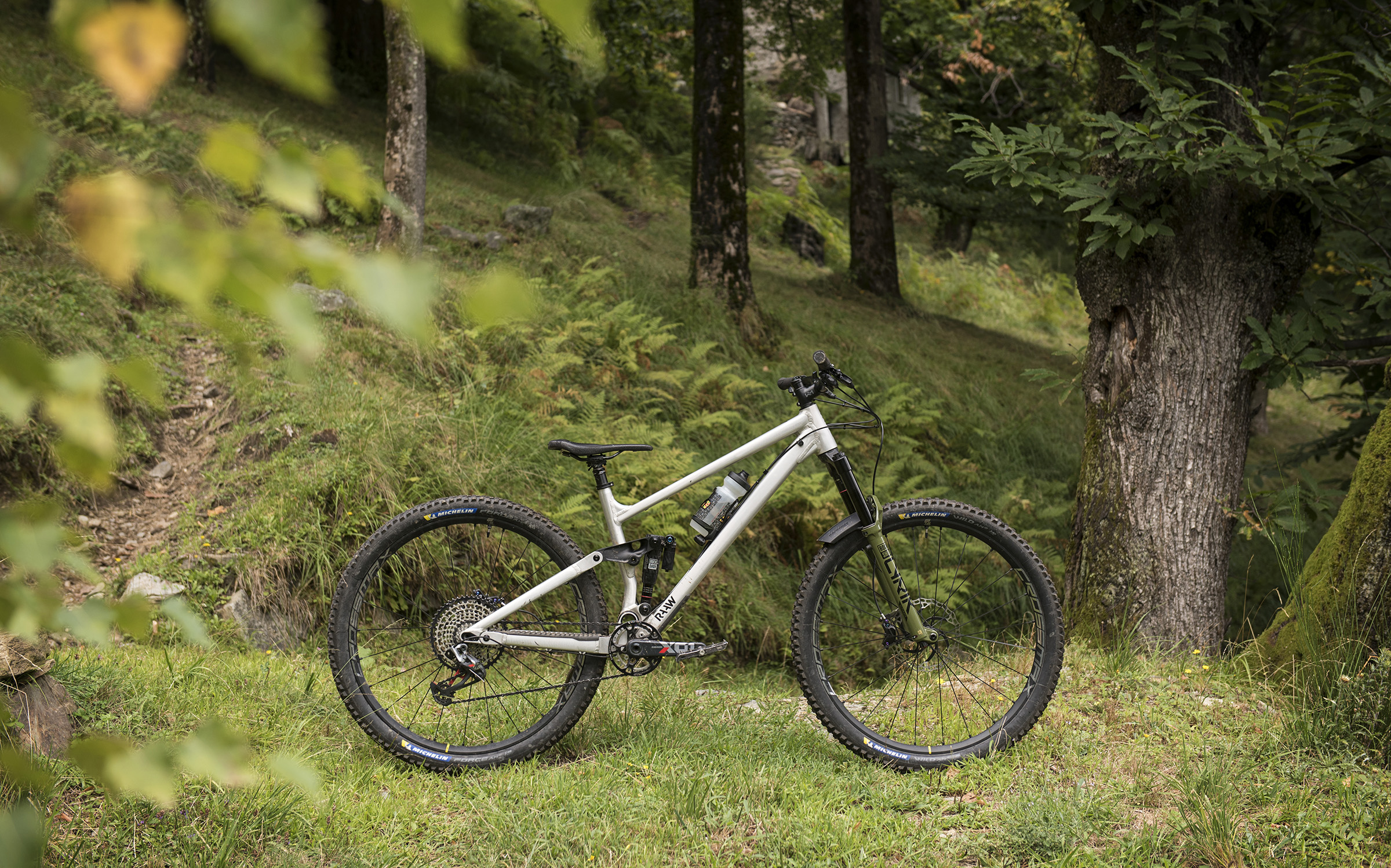 Ruben Torenbeek had het antwoord. Ruben is een Duitse mountainbikeontwerper van Nederlandse komaf, die ik heb leren kennen toen hij bij Ghost Bikes werkte en die in 2016 met zijn eigen merk Raaw is begonnen. Z’n eerste model onder die merknaam was de Madonna, een dikke enduro met 160 millimeter veerweg aan de achterkant. En in 2021 volgde de Jibb, een trailbike met 135 millimeter veerweg achteraan en 150 millimeter aan de voorkant. Precies goed voor ‘onze’ RockShox Lyrik testvork. En nóg beter: Raaw heeft de Jibb gewoon op voorraad.