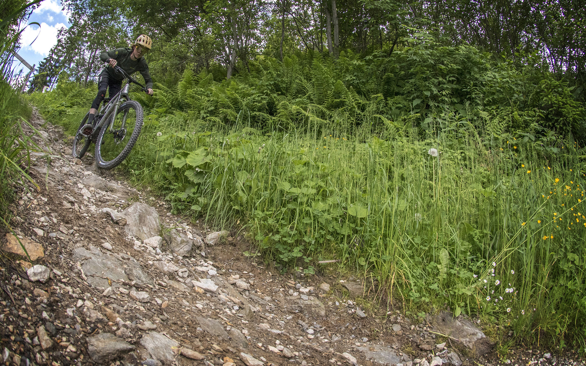 Op die Como-trails wordt nog duidelijker dat de Jibb over een geheel eigen karakter beschikt. Bij veel trailbikes moet je je lijnen zorgvuldig kiezen, de veerweg is immers beperkt. Het positieve daaraan is dat je vanwege de tegendruk die de vering geeft, makkelijk overal overheen hopt. Ondanks dat ook de Raaw Jibb een relatief beperkte veerweg heeft, rijdt-ie toch anders. Het is veel meer een mini-enduro dan een poppy trailbike. Voor mij persoonlijk is dat een plus; je kunt met deze Raaw namelijk echt ongenadig hard naar beneden, zónder afgestraft te worden. Niet solide, maar supersolide. Ja, je moet er dan wel écht voor gaan. Maar doe je dat, dan kun je met deze bike boven jezelf uitstijgen. Althans, dat gevoel heb ik op de Jibb. Dat ik een betere biker ben dan ik ben. En dat voelt goed.