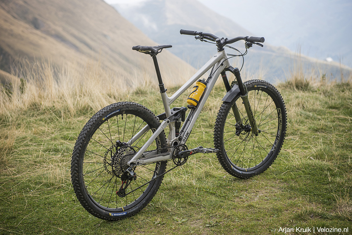 Bijzondere bike, die Raaw Jibb. En dan doel ik niet zozeer op het feit dat deze boutique-bike alleen maar met een aluminium frame te verkrijgen is, maar vooral op hoe-ie rijdt. Voor een bike met maar 135 millimeter veerweg aan de achterkant is-ie namelijk ongekend capabel in de afdaling. Meer een mini-enduro dan een trailbike, maar dan zónder in te leveren op eigenschappen die voor trailbikes van belang zijn. Zo peddel je ‘m ondanks z’n hoge gewicht efficiënt en comfortabel omhoog. En ondanks z’n lengte is-ie ook in smalle kronkelpassages wendbaar genoeg. Het enige dat voor mij lastig blijft is het uitvoeren van manuals. Een kortere achterbrug zou dat makkelijker maken, maar tevens de balans verstoren tussen voor- en achterwiel. Terwijl het juist deze balans is waardoor de Jibb zo schandalig lekker door snelle bochten gaat.