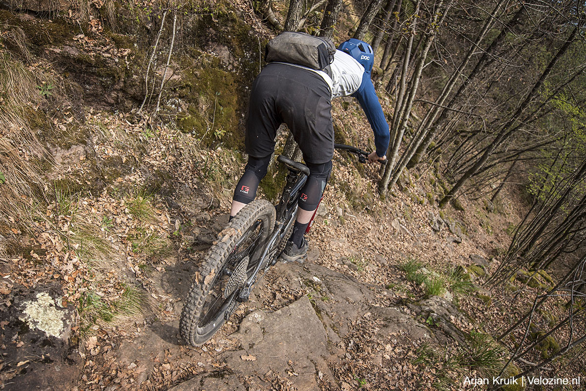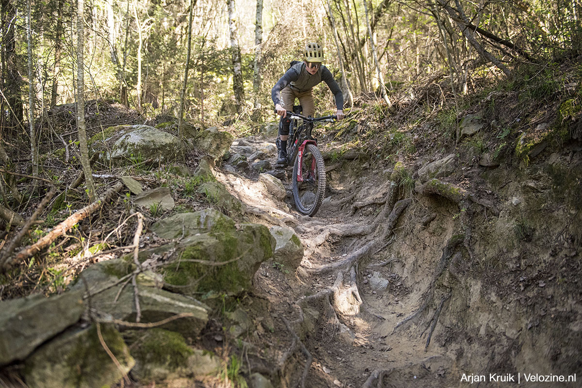 Het digitale protocol waarmee de AXS-versteller de dropper activeert reageert razendsnel, van enige merkbare vertraging bij het doorsturen van de instructies van mijn duim is naar mijn idee geen sprake. Drukken, omlaag, weer drukken, omhoog. De tegendruk die de Rockshox-pen levert is wel redelijk hoog. Hetzelfde geldt voor de snelheid waarmee de pen terugkeert in z’n hoogste stand. Pok! Als je wilt dat de pen wat makkelijker zakt en wat minder snel omhoog komt, kun je met een demperpomp de luchtdruk in de pen aanpassen.