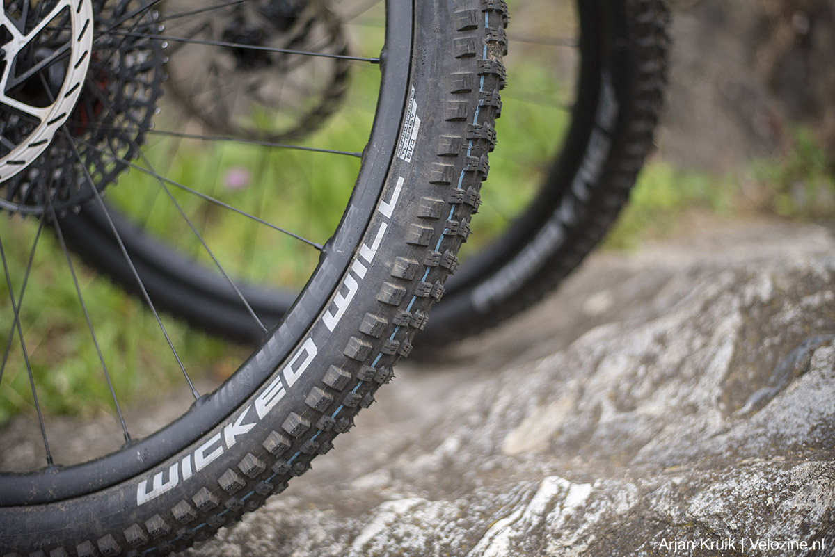 Toen Schwalbe me vroeg of ik de combinatie van Wicked Will als achterband en Nobby Nic als voorband wilde proberen, viel het nog niet mee een keuze te maken. Beide modellen worden door Schwalbe in een grote verscheidenheid aan breedtematen, karkassen en rubber-compounds aangeboden. Dat het 29 inch wordt staat buiten kijf, dat is de wieldiameter van mijn Giant Trance, de beoogde testfiets. En dat de breedte 2.4 inch wordt is ook geen punt van discussie: bij wielen met een binnenbreedte van rond de dertig millimeter moet je niet veel smaller rubber gaan rijden. De extra brede 2.6 inch uitvoering, die Schwalbe ook in z’n assortiment heeft, sla ik ook graag over. Dergelijk brede rubbers vind ik vanwege hun grote volume op een spierfiets iets te ongedefinieerd aanvoelen, zo heb ik eerder ervaren.
