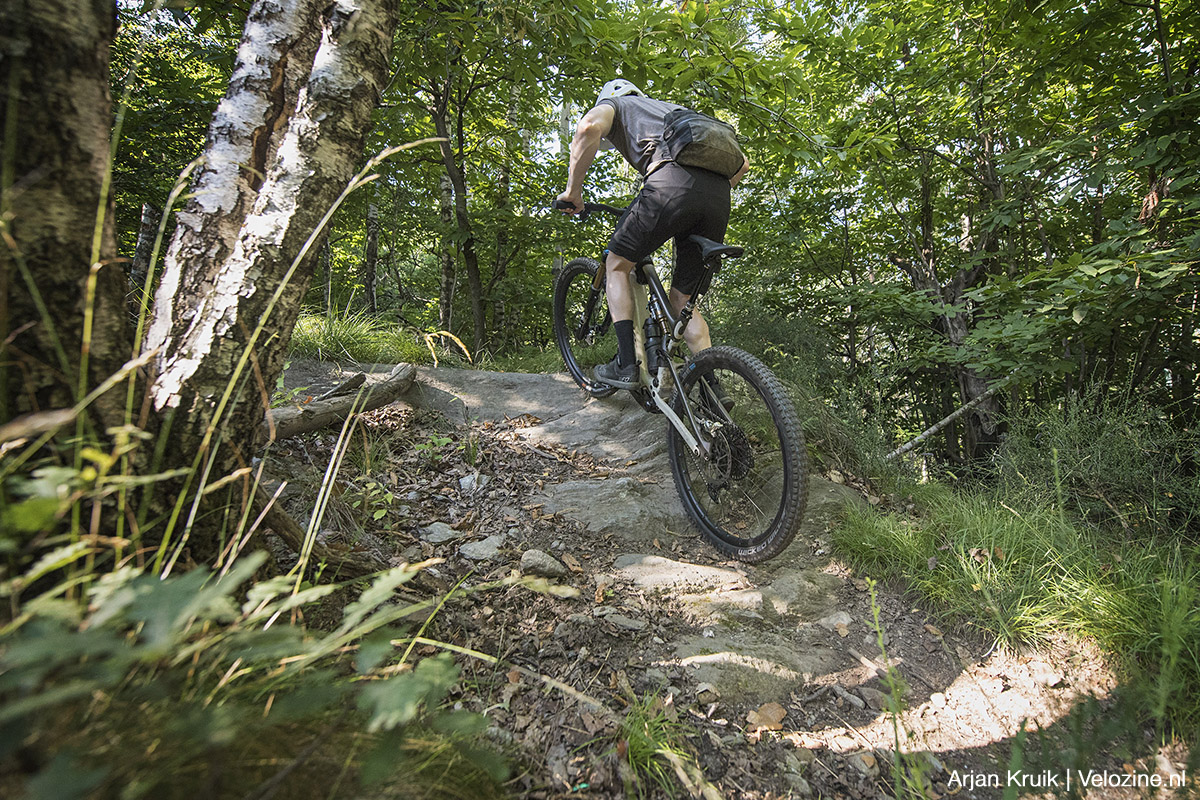 Nog even dit: wie op de actiefoto’s hieronder geen Giant Trance-spierfiets denkt te zien, maar een Specialized Turbo Levo SL e-mountainbike, die heeft gelijk. Dat zit zo: vlak voor vertrek naar Italië kwam een langverwachte e-mountainbike van Merida de redactie binnenrollen. En die moést ook mee. Maar omdat de Velozine-bus al vol zat, hadden we met die Merida erbij een fiets teveel. Je snapt het al: mijn geliefde Trance moest thuisblijven. Ik heb daarom de wielset met de Wicked Will en de Nobby Nick maar in de bus gezet en in Italië in de Turbo Levo SL gestoken.