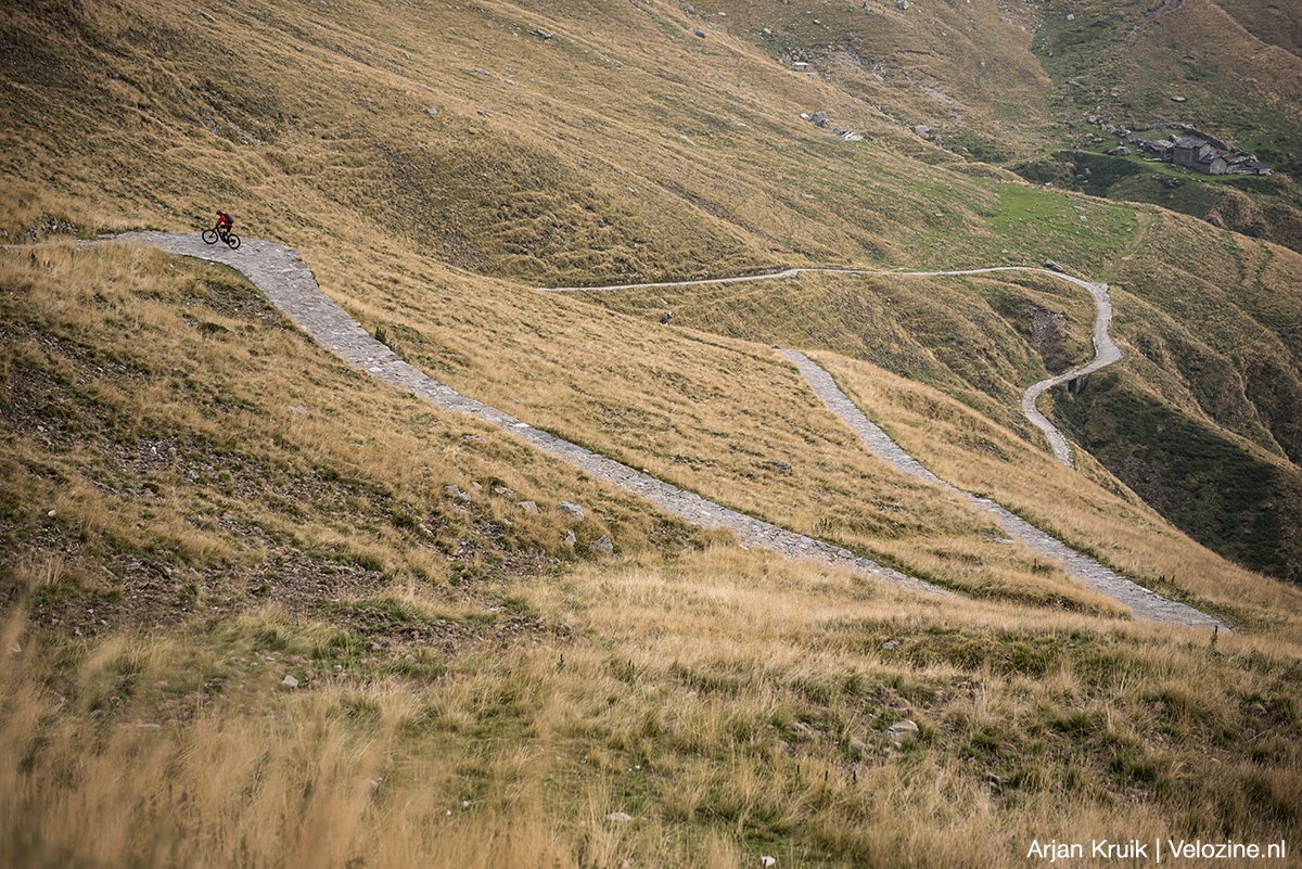 De natuurlijke ondersteuning van de Shimano EP8-motor maakt bij het beklimmen van technische trails dus echt indruk. Maar hoe zit dat bij een veel traditioneler gebruik van een e-bike: ouderwets hoogtemeters maken over grindwegen? Tijd voor een grote tocht; omhoog naar de Passo San Jorio, een bergpas op 2.012 meter op de grens van Italië en Zwitserland. Aantal hoogtemeters tussen het Comomeer en de Passo San Jorio: ruim 1.800! De eerste 1.000 hoogtemeters lopen relatief gematigd stijgend over asfalt, daarna bestaat de ondergrond uit grind en keien. Om met één acculading zo hoog mogelijk te komen, rijd ik in de eco-stand. Vanzelf gaat het klimmen daarmee niet, maar altijd nog gemakkelijker en vooral sneller dan op een mountainbike zonder trapondersteuning.