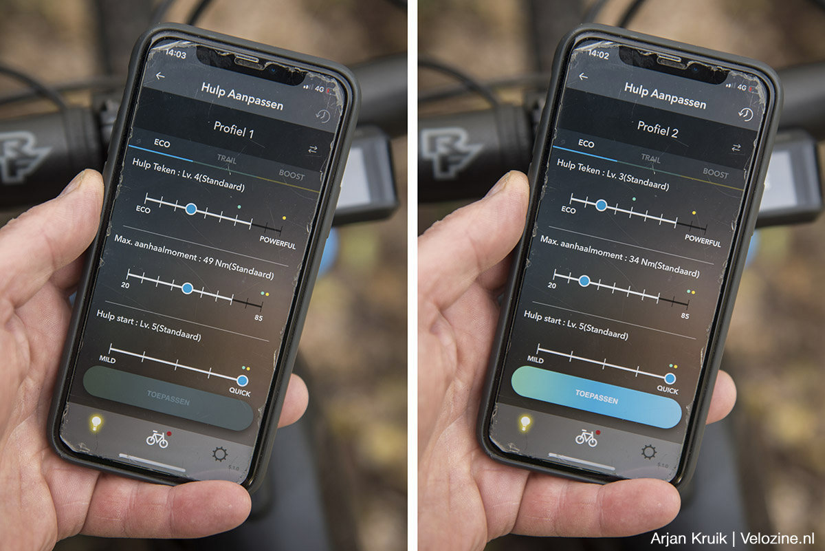 Zinvol, die extra instelbaarheid, of gewoon de zoveelste gimmick? Ik denk dat het antwoord afhangt van je verhouding tot elektronica in het algemeen en je persoonlijke mountainbikewensen in het bijzonder. Ik ben content met de fabrieksinstellingen, dus voor mij heeft zo’n app niet veel toegevoegde waarde. Maar dát instelbaarheid van de verschillende modi zinvol kan zijn, staat buiten kijf. Zo kan ik me voorstellen dat je de ondersteuning in de trail-stand terugdraait om zodoende de actieradius te vergroten, zónder in te leveren op de variabele ondersteuning die de trail-modus biedt. Of dat je het koppel in de boost stand wat reduceert, zodat je de bike in steile secties minder snel achterover trekt. Alles kan, maar juist dát maakt het instellen redelijk complex. Het lijkt me daarom niet onverstandig, eventuele aanpassingen pas door te voeren als je je EP8-e-bike goed hebt leren kennen. En verander dan maar één variabele per keer.