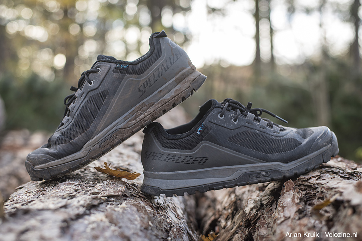 Het uiterlijk van de Rime Flat is gelukkig niet representatief voor de fietseigenschappen. Als je niet beter weet zou je namelijk kunnen denken dat het een paar hardcore hikers is. Specialized laat de voor flatpedal-schoenen obligatoire skatelook volledig los en kiest het nadrukkelijk voor een outdoor-uitstraling. Ook de opbouw van de schoen is meer hike dan bike; tussen de profielzool en het bovenwerk zit een dikke tussenzool van EVA-schuim en ook de uitstekende achterkant van de profielzool – die bij het neergekomen van de hiel voor demping moet zorgen – is iets dat je eerder verwacht op een wandelschoen dan op een mountainbikeschoen.