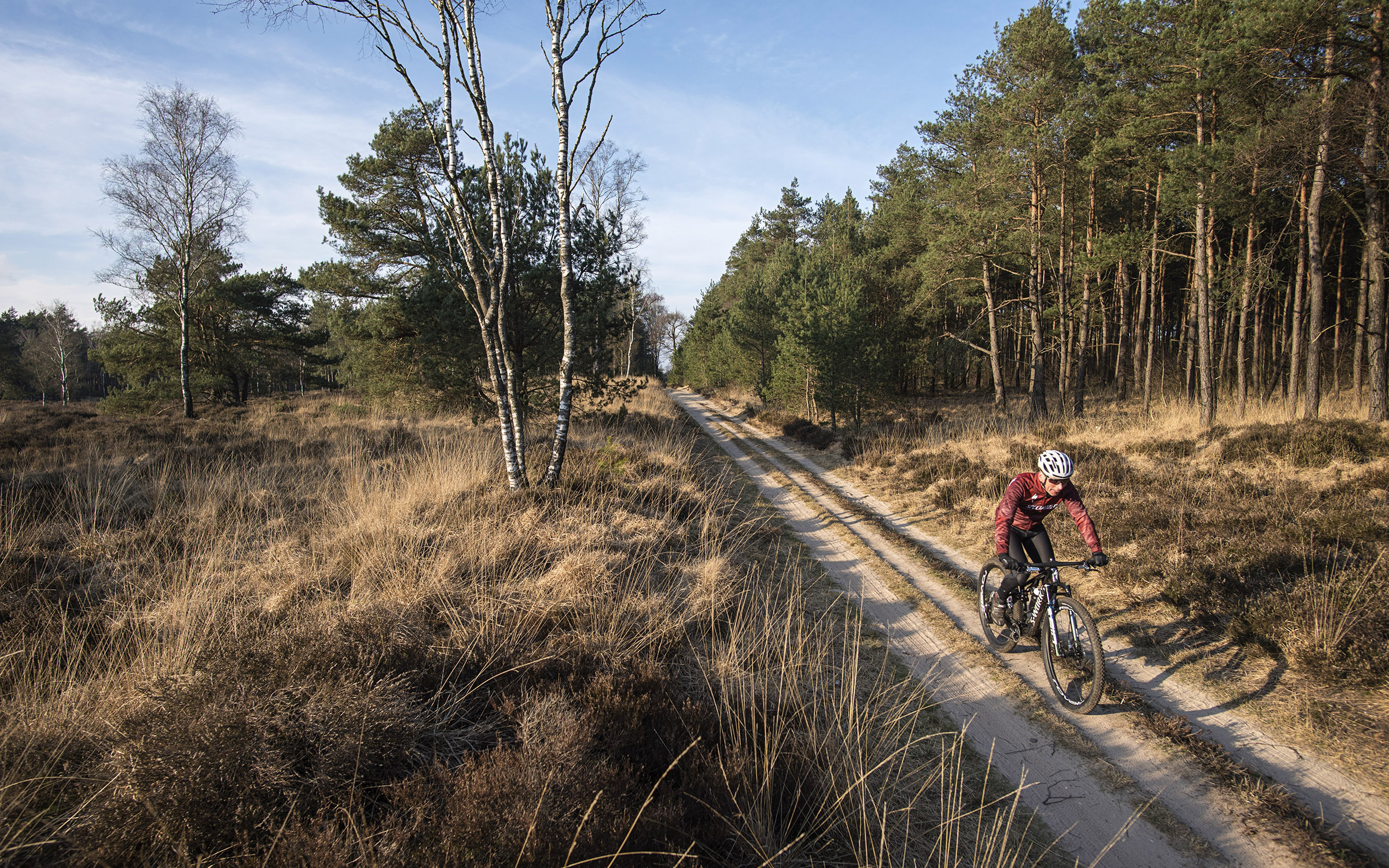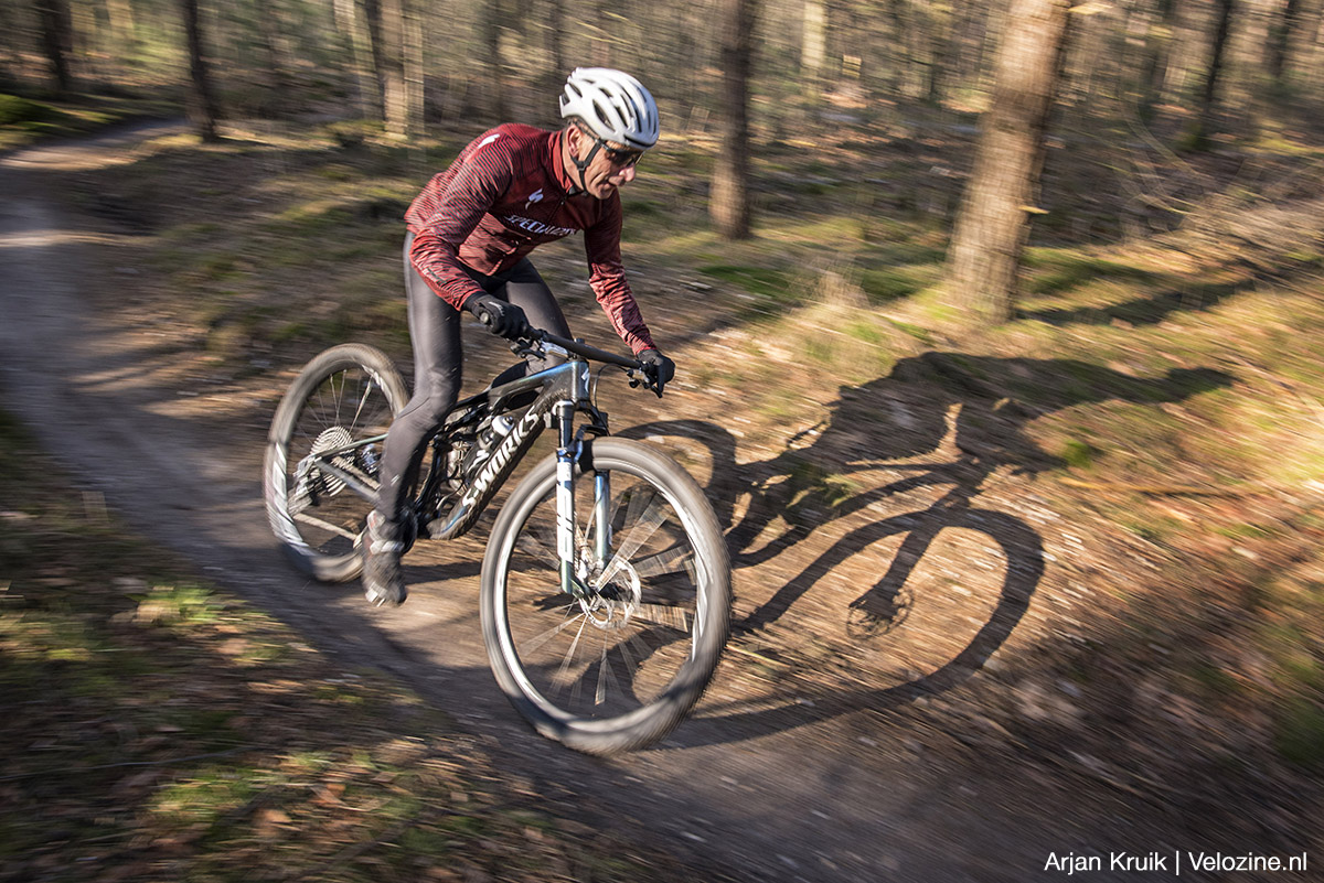 De eerste meters voelen gelijk vertrouwd. Niet zo gek, gezien de geometrische overeenkomsten tussen mijn eigen S-Works Epic en de nieuwe S-Works Epic 8. Zoals ik hierboven al schreef zit ik vanwege de specifieke aanpassingen aan mijn eigen Epic een tikkie korter op de Epic 8. Echter niet in die mate dat het storend is. Wel opvallend is het veranderde stuurgedrag. Op lage snelheden heeft het wiel de neiging ‘om te vallen’. Eveneens niet storend, maar wel anders. Voer je het tempo op – en dat is iets dat ik graag doe – dan verdwijnt dat effect en maakt het plaats voor stabiliteit en controle. Je kunt echt ongenadig hard de aanval op een kuipbocht openen en er als winnaar uitkomen. En ook in de paar steile secties die Schaarsbergen rijk is, voelt het prettig om het zwaartepunt meer achter de vooras te hebben.