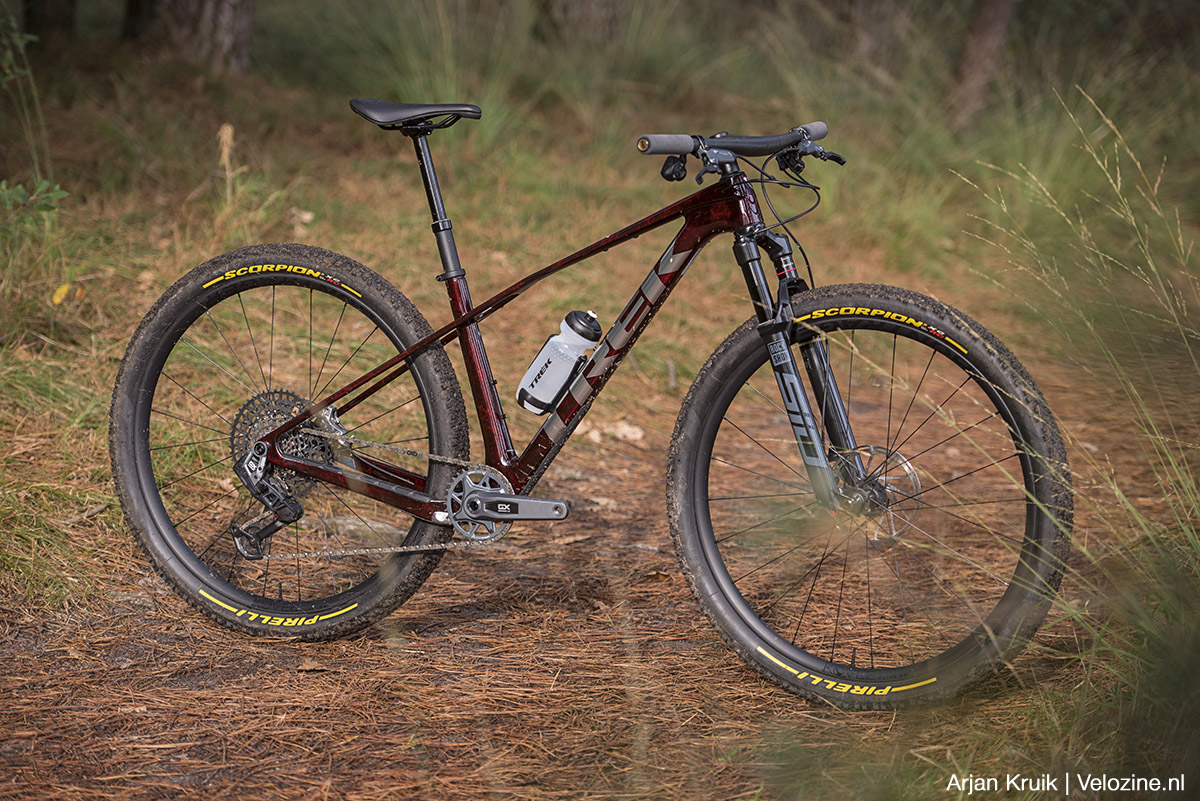 Trek hangt in het frame van de Procaliber 9.7 een set Kovee Elite 30’s van huismerk Bontrager. Met 1.585 gram niet de lichtste carbon wielset van dit Amerikaanse merk, maar als het gaat om betrouwbaarheid en sterkte zit je beslist goed. Bovendien hebben ze een royale binnenbreedte van 29 millimeter, waardoor de 2.4 inch brede Scorpions van Pirelli mooi vallen. Merk op: de productiemodellen van de Procaliber 9.7 staan niet op Pirelli’s, maar op Sainte-Anne’s van Bontrager. Gelukkig, zeg ik er gelijk bij, want ondanks dat geel een supersnelle kleur is, zijn de crosscountry-sloffen van Pirelli veel minder snel dan je op basis van het minimalistische profiel zou verwachten. De rubbers op mijn eigen bike, een combinatie van Schwalbe’s Thunder Burt en Racing Ray, gaan écht vlotter vooruit.