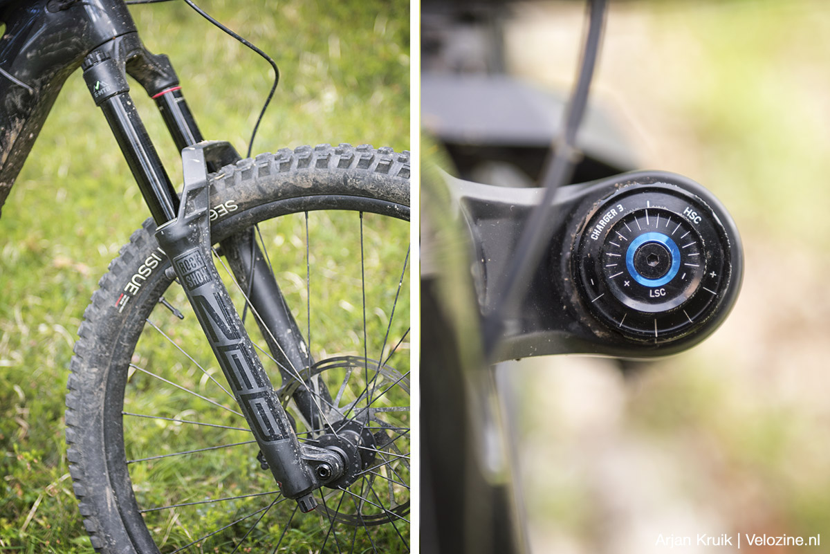 Aan de achterkant is een Rockshox Super Deluxe Select+ verantwoordelijk voor het opvangen van de schokken. De uitgaande demping is goed in te stellen, voor wat betreft de ingaande demping is er slechts keuze uit open of dicht, waarbij “dicht” niet geheel op slot is, maar een klimstand met extra veel demping van de ingaande slag. Nodig bij een e-bike, zo’n klimstand? Toch wel. Met name in lange en steile klimpassages over asfalt geeft de klimstand toch het gevoel dat je minder energie verspilt.