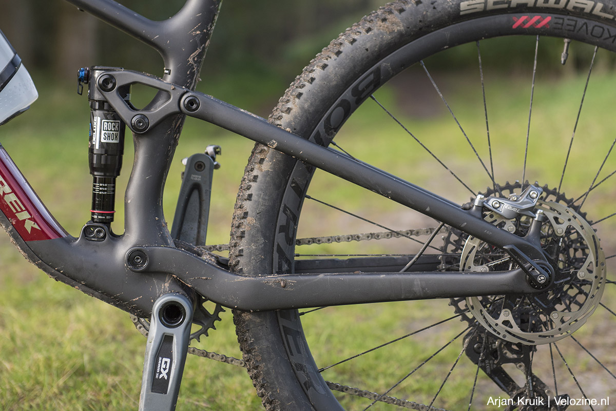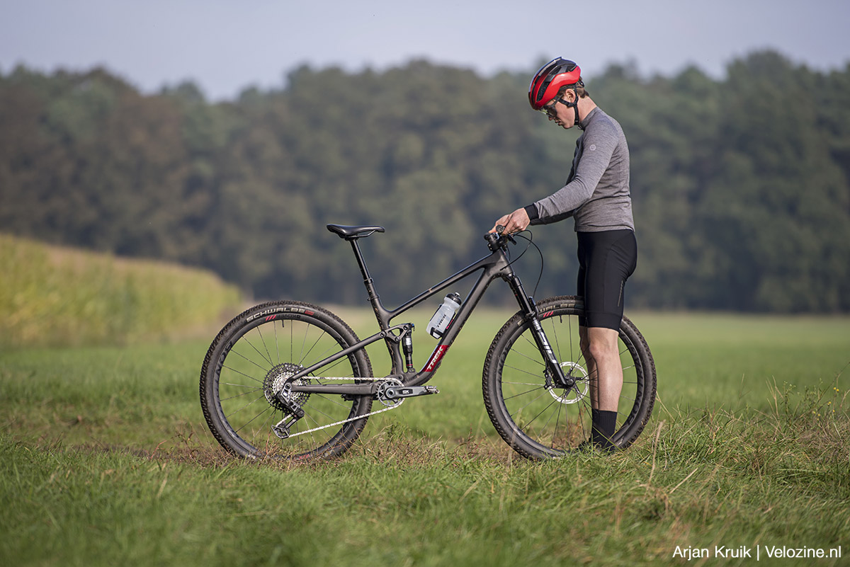 Wat voor de voorvork en de cockpit geldt, gaat ook op voor de roterende massa: voor gebruik in Nederland heb ik de Top Fuel wat meer getrimt richting xc. Concreet: ik heb ‘m op lichtgewicht carbon Bontrager Kovee-wielen en lichtrollende xc-banden van Schwalbe gezet. Daarmee is deze carbon fully niet alleen supersnel op snelheid, maar blíjft-ie ook rollen. Een heerlijk gevoel.