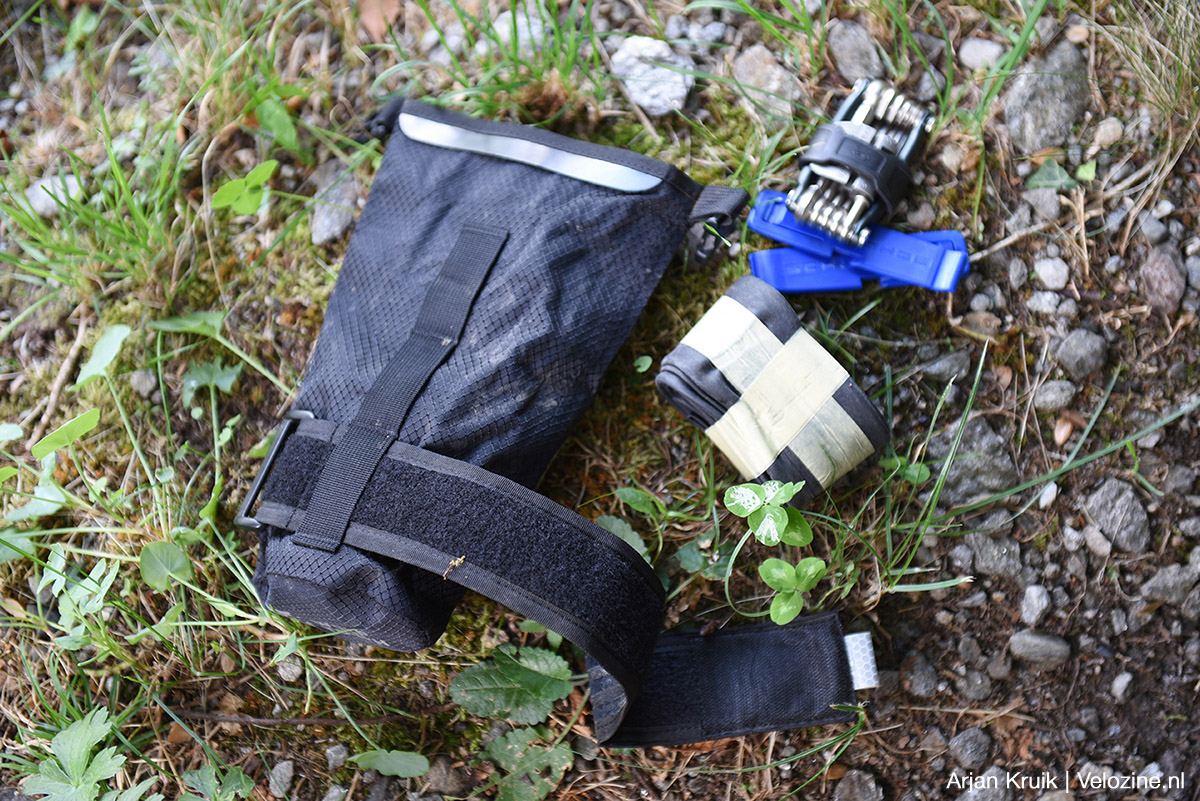 Tijdens lange tochten geen omkijken naar de Wolf Tooth B-RAD Roll-Top Bag, hij zit echt vast als een huis. Echter, áls je bij de inhoud moet zijn, dan is dat wat bewerkelijker dan bij bijvoorbeeld een bovenbuistasje met rits. Immers; voordat je bij de binnenkant kunt, moet je eerst het tasje losmaken en vervolgens de sluiting openrollen. Daar staat tegenover dat je spullen vanwege de brede compressieband volledig rammelvrij in het Wolf Tooth-tasje zitten. En dat is bij een bovenbuistasje wel anders! Desalniettemin gebruik ik de B-RAD Roll-Top Bag vooral voor zaken die ik eigenlijk nooit nodig heb, maar die ik wél bij me moet hebben. Denk aan binnenbanden(en), bandenlichters, kettingschakels en een multitool. Aangezien ik in Nederland bij mijn wekelijkse rondje door het bos geen reserveband meeneem – sinds ik tubeless rijd heb ik in Nederland nooit meer lek gereden – neemt een compact regenjack de plek in van de band en de bandenlichters. Ook handig.