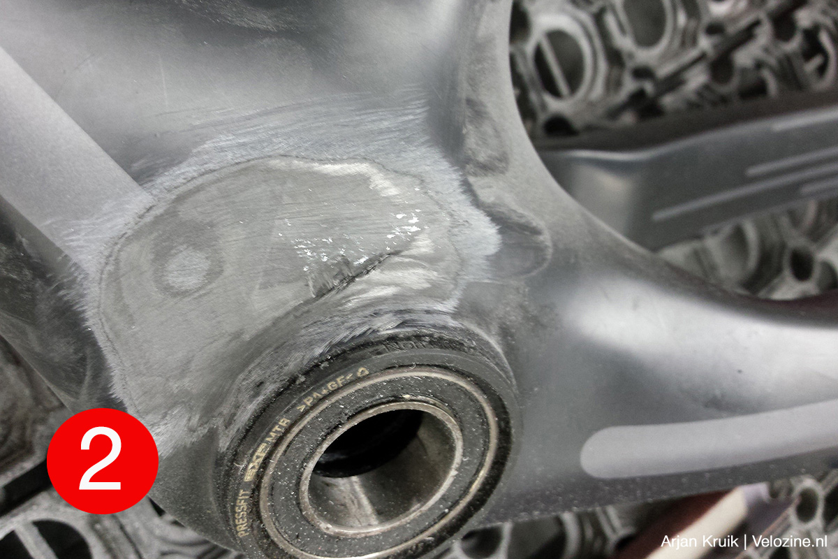 Ook de scheur boven de trapas van mijn ruim acht jaar oude Haibike Greed (foto 1) is volgens carbonspecialist Casper van Ee van Bikes4You in Emmen ontstaan in het productieproces. “Vermoedelijk is bij het lamineren lucht tussen de verschillende lagen blijven zitten, waardoor een zwakke plek is ontstaan. De scheur is daardoor ook niet door en door. Dit soort schade is prima en onzichtbaar te repareren,” aldus Casper. Op mijn vraag hoe ver je kunt gaan, meldt de carbon-expert dat de beperkte factor niet zozeer de ernst van de schade is, als wel tijd die het kost om een reparatie uit te voeren. “In principe is bijna alles te repareren, zelfs als je frame letterlijk in tweeën ligt.”