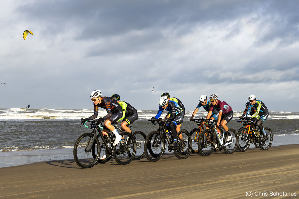 Maar er speelt nog iets, zo legt Martin Schutter toe: “We willen ook kijken of het bij het op- en afstappen in het mulle zand een voordeel geeft”. Een logische gedachte. Want als de kopgroep bij elkaar blijft tot op de strandafgang, dan is de uiteindelijke winnaar vaak degene die het snelst van de fiets afspringt en door het losse zand weet te lopen…