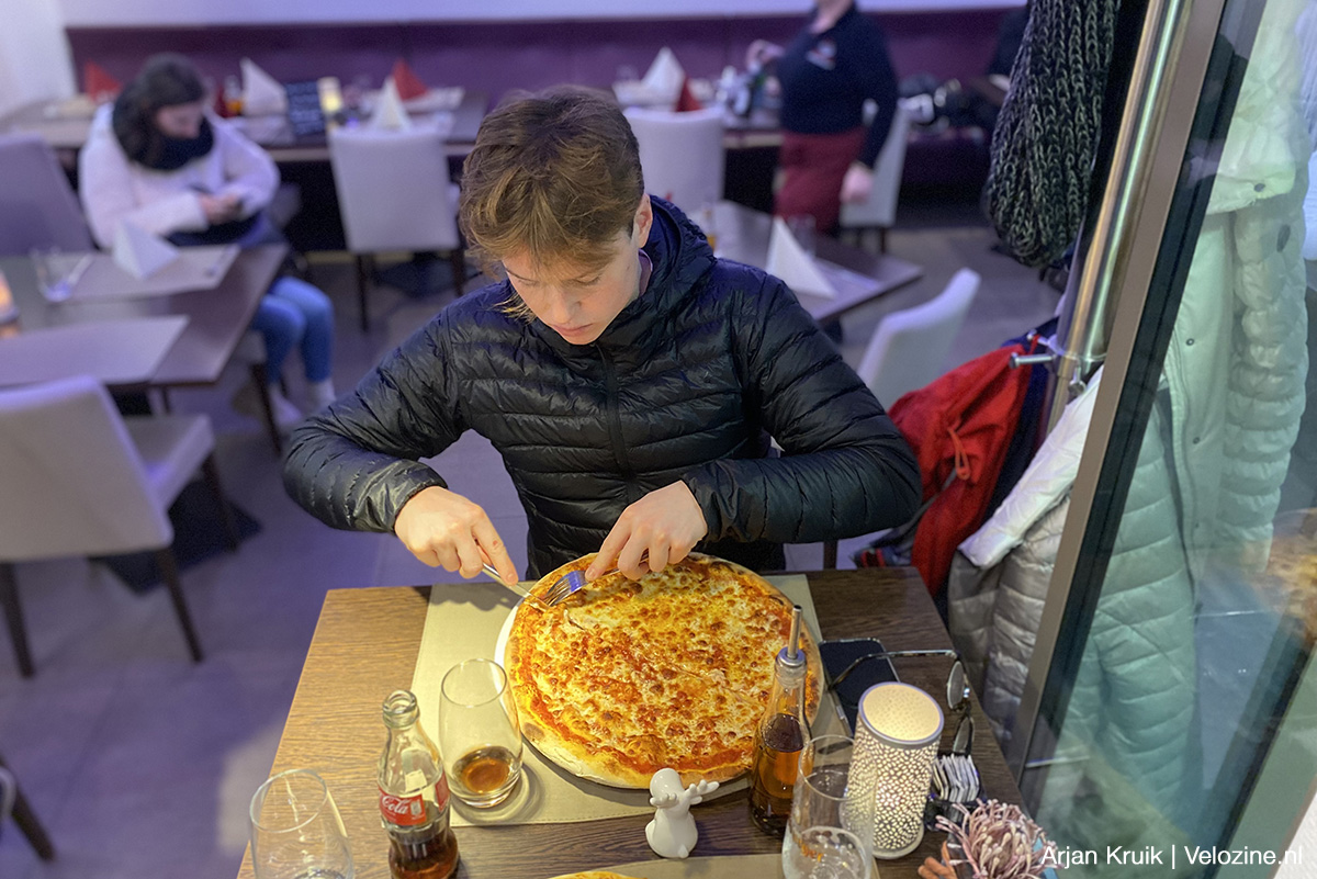 Een uur of anderhalf later zitten we fris gewassen in Il Vecchio Pozzo in Sankt Vith. Aan de verlichting mogen ze in deze pizzeria nog wel wat aandacht schenken, maar de pizza’s zijn echt top! En datzelfde geldt, zo concluderen we al smikkelend, voor de mountainbikeroute die we vandaag gereden hebben. Het is in alle opzichten écht een andere beleving dan de Nederlandse routes, met meer hoogtemeters, meer variatie in ondergrond en meer uitdaging. Laat je door dat laatste overigens niet afschrikken, want je kunt de Schönberg-ronde prima met een hardtail of – zoals wij – met een xc-fully rijden.