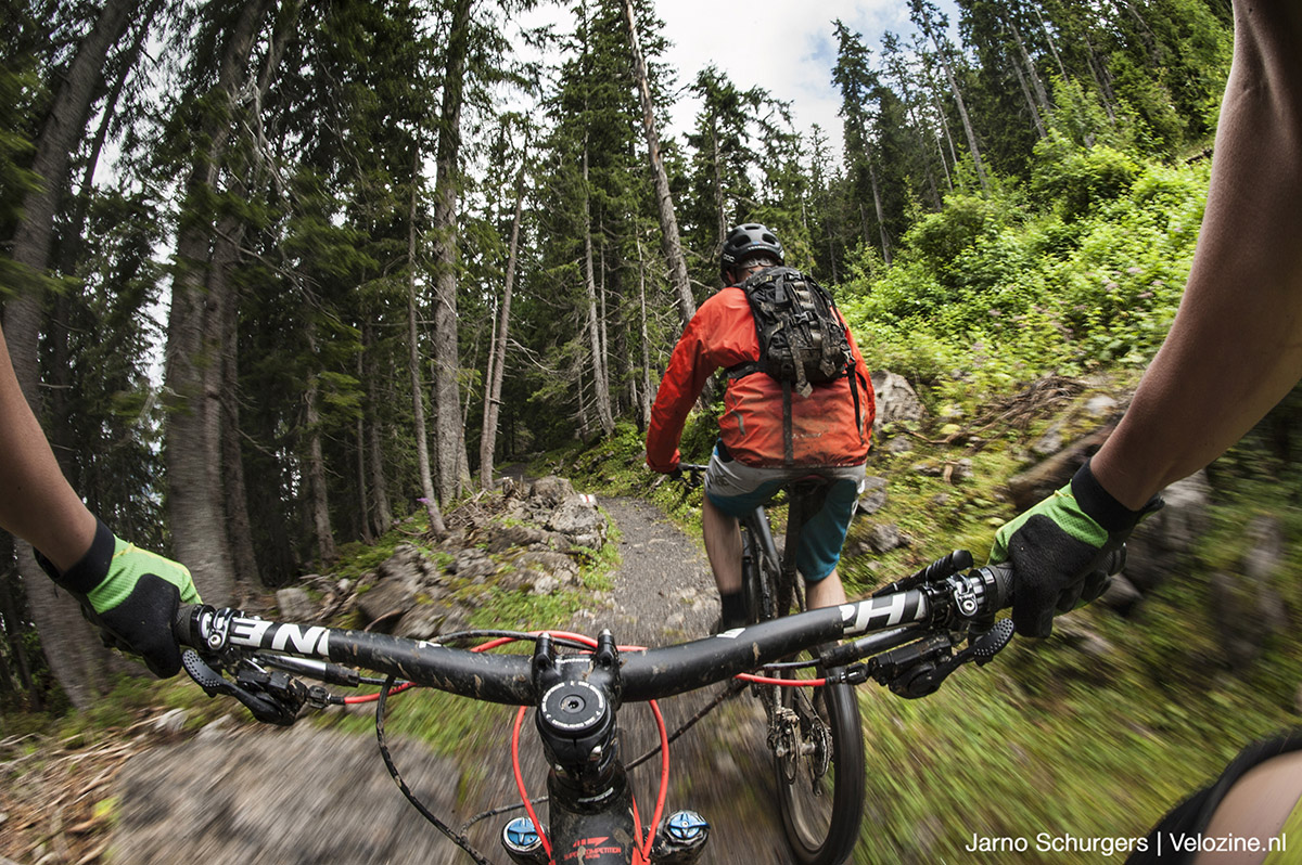 Dachten we dat we het de eerste dag wel voor onze kiezen hebben gekregen als het om listige paadjes gaat, de tweede dag blijkt dat nog maar kinderspel. De Walegg-route die we vandaag met Dario gaan rijden is er echt eentje voor volbloed berggeiten! Vanuit het dal nemen we de lift naar Ristis op 1.600 meter hoogte. Vanaf daar gaat het fietsend over een smal, steil en stenig pad naar bijna 1.900 meter. Dan is het gedaan. Het pad is te steil en te moeilijk en de benen willen ook niet meer. En dus gaan de bikes in de nek en lopen we de resterende hoogtemeters.