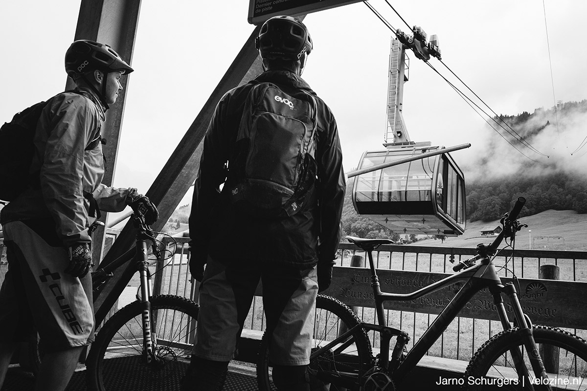 Eenmaal boven, na een ritje in een zeer klein gondeltje, gaat het dan echt beginnen. Maar eerst nog even rondkijken. Vanaf de Fürenalp is een groot deel van het dal van Engelberg te overzien. Mooi! De route waarover Dario ons meevoert begint als een gewoon wandelpad, maar als snel muteert dit in een van de meest technische trails die ik ooit gereden heb, met tussen de uitdagende stukken mooie, snelle paden. Als je dat combineert met het fenomenale uitzicht, dan snap je dat we ons erg goed vermaken.