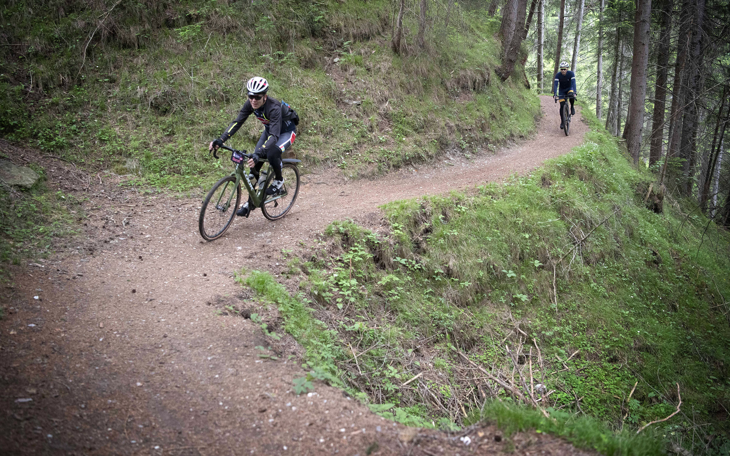 In mijn groepje doe ik een kennismakingsbabbelrondje. Wat ik daarbij hoor wordt later op de dag, als we een stukkie singetrack en een alpenweide afdalen, bevestigd: de deelnemers komen allemaal vanuit de wegfietswereld. Mijn fietsmakker én fotograaf van dienst Ruben en ik zijn de enige mountainbikers. Sommigen gravelen zelfs pas sinds een paar weken. Deze off road-ervaring moet voor hen nog wel extra bijzonder zijn!