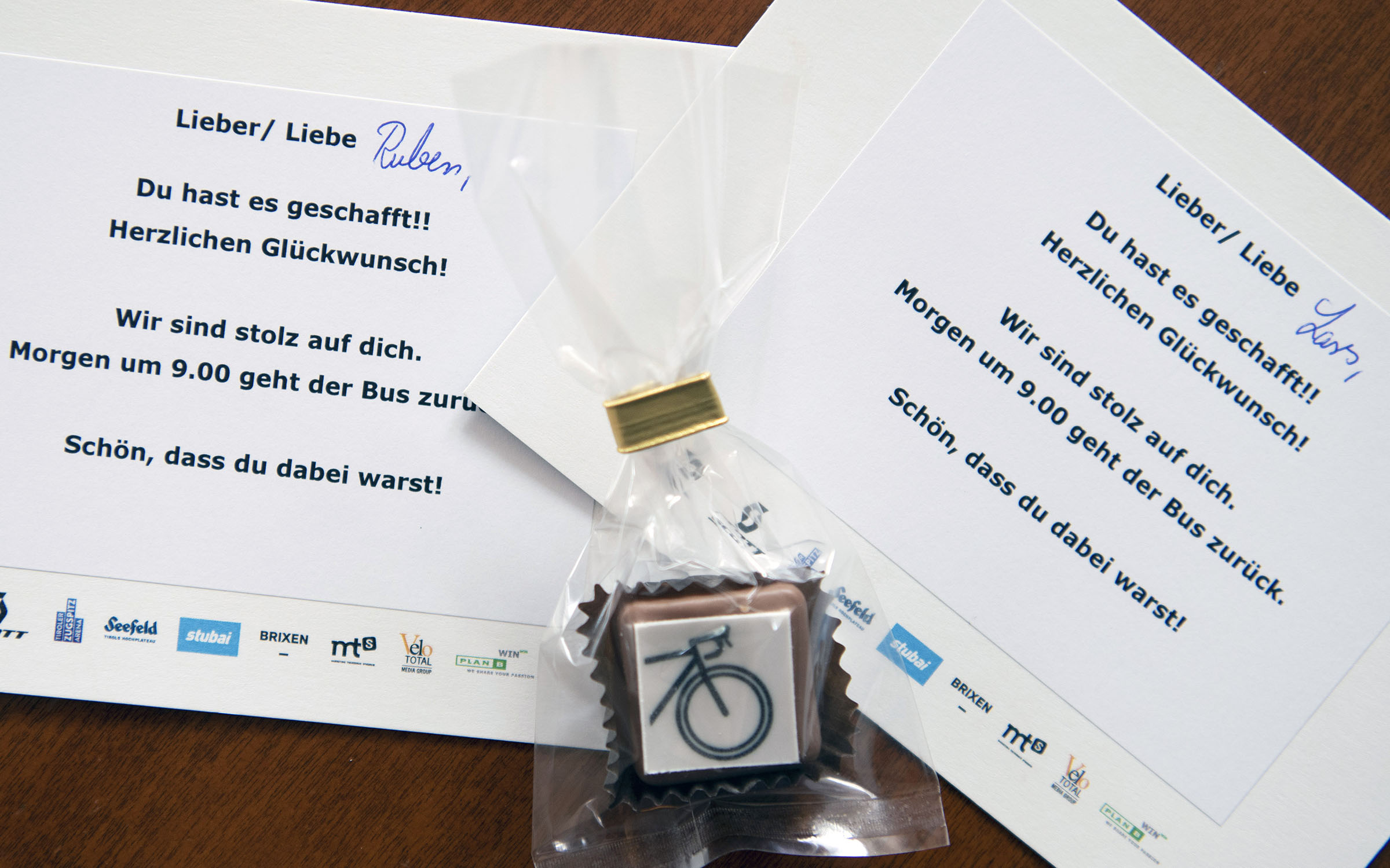 Hoe dan ook, we zijn Italië, de zon schijnt, hebben wind mee en moeten nog 40 km golvend maar hoofdzakelijk bergaf. Dus is het koers! Iedereen rijdt zijn tankje leeg richting de finish en elk heuveltje wordt impliciet als sprint aangemerkt. Forza! Toch lukt het – grotendeels – als groep Brixen binnen te rollen. We mogen dwars door de smalle winkelstraatjes slalommen tot de finish van deze Gravelbike Experience op het grote plein. Geschafft!